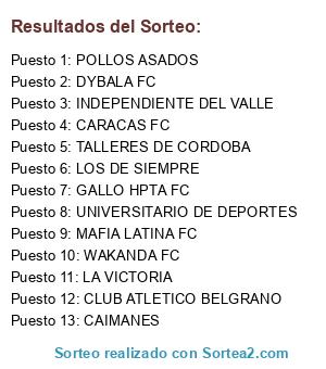 Lista de participantes: CLUB ATLETICO BELGRANO, CAIMANES, UNIVERSITARIO DE DEPORTES, MAFIA LATINA FC, CARACAS FC, ALL STARS, LOS DE SIEMPRE, WAKANDA FC, WELWYN GALAXY FC, DEPORTIVO TACHIRA FC, GALLO HPTA FC, TALLERES DE CORDOBA, INDEPENDIENTE DEL VALLE, MEMPHIS WOLVES, LA VICTORIA, MIRMIDONES FC, DYBALA FC, POLLOS ASADOS.
