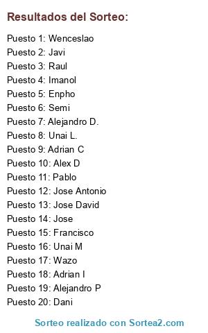 Lista de participantes: Alejandro P, Unai L., Alejandro D., Imanol, Wazo, Jose David, Unai M, Adrian C, Adrian I, Jose Antonio, Wenceslao, Enpho, Jose, Alex D, Javi, Raul, Dani, Semi, Francisco, Pablo.
