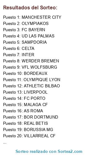 Lista de participantes: VFL WOLFSBURG, FC PORTO, CELTA, BORUSSIA MG, AS ROMA, REAL BETIS, UD LAS PALMAS, OLYMPIAKOS, OLYMPIQUE LYON, VILLARREAL CF, BOR DORTMUND, LIVERPOOL, MALAGA CF, WERDER BREMEN, MANCHESTER CITY, ATLETICO MADRID, FC BAYERN, MARSEILLE, SAMPDORIA, ATHLETIC BILBAO, BORDEAUX, INTER.