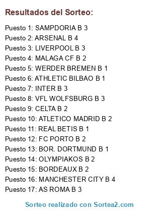 Lista de participantes: BORDEAUX B 2, VFL WOLFSBURG B 3, INTER B 3, ATHLETIC BILBAO B 1, BOR. DORTMUND B 1, FC PORTO B 2, OLYMPIAKOS B 2, SAMPDORIA B 3, WERDER BREMEN B 1, CELTA B 2, REAL BETIS B 1, LIVERPOOL B 3, ATLETICO MADRID B 2, MANCHESTER CITY B 4, MALAGA CF B 2, AS ROMA B 3, ARSENAL B 4.