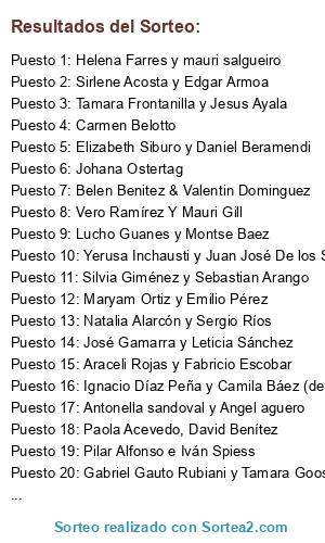 Lista de participantes: Marcelo y Micaela Gross Brown, Vero Ramírez Y Mauri Gill, Gabriel Gauto Rubiani y Tamara Goossen Elías, Patty Lacasa y Pepe Daglio, Tamara Frontanilla y Jesus Ayala, Ayelen Watzlawik y Fernando Larré!, Natalia Alarcón y Sergio Ríos, Rodolfo Ayala y Araceli Oviedo, Lucho Guanes y Montse Baez, Helena Farres y mauri salgueiro, Paola Acevedo y David Benitez, Elizabeth Siburo y Daniel Beramendi, Sofía Peroni y oscar armoa, Belén Irala y Sebastián Cáceres, Teresa Barrios y Beltrán Samaniego, Leonado Irepa y Shilka Thomas, Pamela SUE Perstling, Max de Filippis y Ceci Quevedo, Geminne Spagnolo y Rodrigo Mateos, César Escobar Gubo y Victoria Abente Fernandez, danielito y andrea, tus cuñis los mejores 💓, Alice Ferreira, Alejandro Sanabria, Patricia Galeano y Elias Rivarola, Silvia Giménez y Sebastian Arango, Marian González y Nelson Benitez, Ignacio Díaz Peña y Camila Báez (de Díaz Peña jeje :P), Johana Ostertag, Aldo y Pachi, Carmen Belotto, Sirlene Acosta y Edgar Armoa, Leticia Rojas y Javier Salinas, Gabriella Picchioni y Manuel Gadea, Sara y Marcos, Araceli Rojas y Fabricio Escobar, Barbie Sitjar y Cesar Gamarra, Pilar Alfonso e Iván Spiess, Victoria Cortesi y Enrique Arias, Paola Acevedo, David Benítez, Koki Oxilia y Beatriz Frutos, Antonella sandoval y Angel aguero, José Gamarra y Leticia Sánchez, Yerusa Inchausti y Juan José De los Santos, Maryam Ortiz y Emilio Pérez, Alan Laufer y Giselle Zaldivar, Maria de la Paz Franco y Sebastian Venica, Belen Benitez & Valentin Dominguez, Enzo Berino y Andre González, Cristina Velázquez y Jorge Mernes.