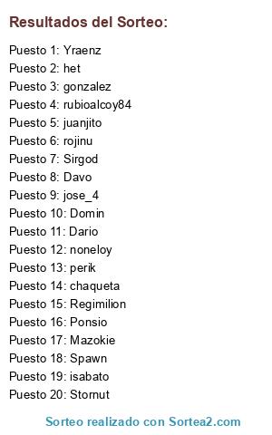 Lista de participantes: Mazokie, Domin, Davo, Dario, Regimilion, Ponsio, Stornut, Yraenz, Spawn, Sirgod, het, juanjito, gonzalez, isabato, jose_4, rojinu, perik, chaqueta, rubioalcoy84, noneloy.