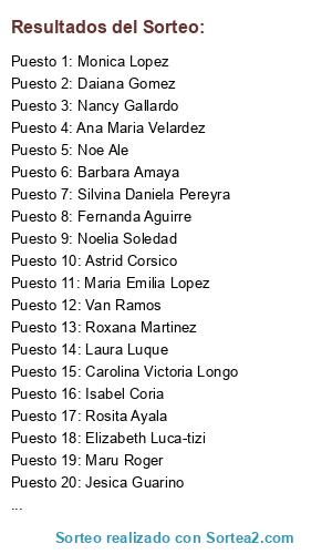 Lista de participantes: Vero Ver, Miriam Alvarado, Silvana Casanova, Griselda Ponce, Lorena Maquiavelo, Nan Rodriguez, Romy Ramos, Carolina Medina, Lore Olmedo, Mendoza Mag Jacque, Jorgelina A. Ibañez, Karina Greco, Andrea Enriquez, Gaby Vazquez, Viky Acosta, Marcela Suarez, Claudia Estela, Rocio Alejandra, Pame Diaz Neidhart, Mercedes De Jesús Leguizamón, Jennifer Denise Fretes, Maru Roger, Carolina Victoria Longo, Monica Lopez, Naty Flores, Astrid Corsico, Monica Vegas, Paola Albornoz, Patricia Gimenez, Jesica Guarino, Romina Paz, Gla Zeta, Liliana Godoy, Maria Emilia Lopez, Carmen Medina, Paula Mariana Kalutich, Patricia Barroso, Liliana Mendéz, Maria Gainza, Frida Sombrerero, Silvina Daniela Pereyra, Noe Ale, José Stanchi, Rosa Luna, Paula A. Perez, Vanina Elisei, Mary Sosa, Alberto Ymabel Chavez, Gabriela Albonico, Joha Mendoza, Lorena Medina, Maria L. Salinas, Maru Cuenca, Natalia Monzon, Noelia Belén, Ri Rodriguez, Zulma Esquivel, Fabiana Mariela Arce, Carolina Griselda, Mariela Gómez, Analia Rosales, Laura Sosa, Paola Segura, Liliana Elisabet Toloza, Rosa Nocemi, Silvina Elisei, Marta Rivas, Marce Calero, Mirta Döhle, Susana Tampakis, Kari Chilito, Laura De Lorenzo, Alicia Rodriguez, Nadia Maciel, Mariela Alvarez, Veronica Darwich, Ale Torres, Adriana Soledad Bravo, Andrea Ricci, Sofia Alejandra Chaile, Sandra Cerrano, Vanesa Acosta, Sabry Salas, Marta Salinas, Anii G Torres, Lili Villalba, Leonor Eze-Sere Gainza, LyLian Diaz, Gabriela V. Ibáñez, Veronica Sosa, Laurita Navarro, Noelia Soledad, Mariana Lator, Amelia Avallos, Elizabeth Carrizo, Isabel Coria, Sabry Castro, Graciela Lorenzo, María Noel Kotas, Maria Rojas, Ana Carla Chan, Elizabeth Luca-tizi, Marina Cuzzolino, Silvia Liliana Vallejos, Mel Avalos, Mariela Montoya, Carolina Coronel, Gabriela Gigena, Romina Igarza, Deby Veliz, Blanca Medina, Racky Angeles, Patricia Saavedra, Virgi Reynoso, Evangelina Marisa Presa, Daiana Gomez, Vane Pohl, Yamila Jensen, Loly Y Nico Higueras, Irene Caballero, María Paula Canclini, Gladys Mabel Figueroa, Graciela Varas, Vanesa Salvetti, Silvana Persampieri, Nadia Cabrera, Roxana Belmontes, Debo Rey, Fernanda Aguirre, Giselle Behrens, Sandi Bravo, Andrea Alvarez, Vani Barberio, Clau Diaz, Sofia Altamiranda, Mika Y Gise Cardo, Debo Alejandra, Rosita Ayala, Cami Sanchez, Nancy Ruzzante, Van Ramos, Adry Bustos, Sabrina Rodríguez, Cintia Alonso, Gaby Barrios, Valeria San Martin, Gachy Rodríguez, Roxana Martinez, Calyro Meolvide, Susana Ramirez, Flavia Matina, Mariel Alvarado, Laura Ro, Gladys Zalazar, Jesica Paola Montenegro, Aurora Vergara, Mirian Oñate, Gise Corvalan, Laura Luque, Mariela Vanesa, Miriam Maciel, Sabrina Olivera, Valeria Orozco, Paola Zalazar, Pame Cabrera, Sol Diaz, Sol Garcia, Jardin Rinconcito DE Luz Barrio Las Nieves, Nancy Gallardo, Miri Taqui, Cintia Melgarejo, Ana De Nicola, Vanesa Zuñiga, Belen Cabrera, Ivys Sino Kien, Marcela Villarreal, Roxana Araujo, Beatriz Matteo, Carolina Shine, Lauchiz Emilse Ibarra, Lorena Carta, Analia Otero, Ro Cerati, Paola Elena Lagardo, Natalia Yulan, Isabel Pratto, Andrea Higuaran, Ludmila Nahir, Ana Maria Velardez, Carolina Alejandra More, Sabrina Perise, Laila Casla, Rosa Ramos, Laura Arias, Laura Mel, Myriam Argañaraz, Miña Lescano Muñoz, Roxana Ramírez, Ceci Puchetta, Barbara Amaya, Estelys RD, Romina Garro, Marcela Carrizo, María Eva Cisneros.