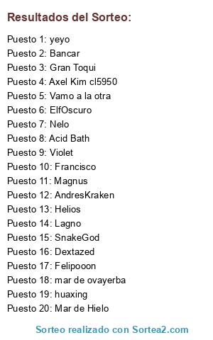 Lista de participantes: Mar de Hielo, yeyo, AndresKraken, Axel Kim cl5950, ElfOscuro, Helios, Francisco, Nelo, Dextazed, SnakeGod, Bancar, Lagno, Acid Bath, Magnus, huaxing, Violet, Vamo a la otra, Felipooon, Gran Toqui, mar de ovayerba.