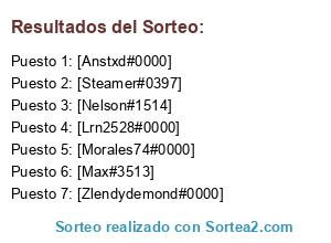 Lista de participantes: [Andres9728#0000], [Cunaguro#0000], [Vencedor309#0000], [Lakriita#0000], [Serena#9012], [Andreacop#2680], [Max#3513], [Kunsita#4602], [Pesimikk#9275], [Yazmin#0732], [Master9345#9566], [Miguellitozl#0000], [Jxnelle#6604], [Minikawaii1#0000], [Scump4#0000], [Destroyer#3340], [Paola#288], [Lrn2528#0000], [Evelynym#0000], [Zlendydemond#0000], [Batman2207#0000], [Ayra19#0000], [Sofi2#7150], [Banisco#0000], [A_games#4247], [Julitatis23#0000], [Dpio#3220], [Steamer#0397], [Nelson#1514], [Penguinraton#0000], [Morales74#0000], [Kimerafi#0000], [Proohlife18#0000], [Malo04#0000], [Shark427#0000], [U_u#2925], [Rattem#0000], [Anstxd#0000], [Pinkeery#7606], [Sr_ganzo#5517], [Luchitoxpm#0000], [K3v1n13#8274], [Lolitas#8787], [Fersaspro#5633], [Entonces_que#4911], [Starkill#8300], [Fak#9976], [Armylds20#0116], [Gati_miau#9504], [Kaneki#8820], [Vane_x#3730], [Sebatys#0000], [Pandres15#8125].