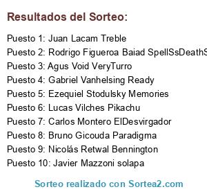 Lista de participantes: Alex Gabii Alzuaga BlesSouls, Axel Casco Sum0, Agus Void VeryTurro, Miguel Steven Laime BANANAZO, Chake Cabj Skynet, Gonzalo Barroso CalvinHarris, Federico Saez Inyourdreams, Ramiro Rojas Spoil, Ezequiel Stodulsky Memories, Maxi Armella Prototype, Franco Piacenza Lifestyle, Lucas Vilches Pikachu, Eze Juárez DJANGO, Dario Pepa Washep, Agustin Serpez Vitalized, Daián Moreyra Leasim, Axel Faversani FENIXX, Axel Faversani Nombreculiao, Javier Mazzoni solapa, Matias Andreani FreakShow, Bruno Gicouda Paradigma, Migue Garcia Karat, Rodrigo Figueroa Baiad SpellSsDeathSs, Daniel Lopez TheBlackRous, Diego Iocca mercarlz, Dario Rios Vercetti, Smooke Rlz Smooke, Matias Matias ZTE, Gabriel Flores LastAvenger, Luciano Martinez MatandoFanes, Diego Castaño Diegoliat, Andres Rodriguez Wii, Garcia D. Mariano Pakku, Ronaldo Avalos rabito, Mauro Ezequiel Dominguez Morlock, Nicolás Retwal Bennington, Alexis Esquivel BorToBeDraIn, Facu Colombo Exception, Carlos Montero ElDesvirgador, Lopezito Leon Reo, Maxi Sotomayor Dummy, Gabriel Vanhelsing Ready, Ger Lacam Ready, Emanuel Garcia ELCHALA, Juany Armella NeverBackDown, Juan Lacam Treble, DjQuiquino Mix TetaDeforme, Juanita Caballero Lewandoski, Ruben Juarez Podolski, Jesus Isaias AndresCalamarOck, Franco Arce NextWeek, Nicolas YKaren MuniecaSystem, Luciana Herrera Camaro, Eugebio Perez Botiquin, Cordoba Rodrigo DeathGhun, Ger Lacam Headshot, Brian Chagas Skecht, Federico Saez InyourDreams, Kevin Albano OscuroDiamante, Sebass Muñiz Kingsman, Mati Nardi DarkSinger, Marcos Quinteros BullDoG.