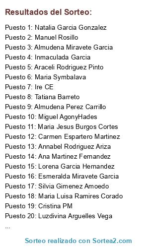 Lista de participantes: Manuel Rosillo, Inmaculada Garcia, Ire CE (2 participaciones), Chelo Molina, Ana Martinez Fernandez (2 participaciones), Mary Fernandez Gonzalez, Cristina PM, Luzdivina Arguelles Vega, Silvia Gimenez Amoedo, Tatiana Barreto, Annabel Rodriguez Ariza (3 participaciones), Lorena Garcia Hernandez, Maria Symbalava (3 participaciones), Carmen Espartero Martinez, Miguel AgonyHades, Maria Luisa Ramires Corado, Ernesto Colado (2 participaciones), Maria Jesus Burgos Cortes, Natalia Garcia Gonzalez, Maribel Sanchez Piñon, Araceli Rodriguez Pinto, Almudena Miravete Garcia, Esmeralda Miravete Garcia, Almudena Perez Carrillo.