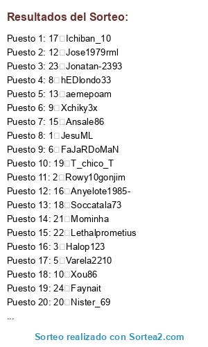 Lista de participantes: 1 JesuML, 2 Rowy10gonjim, 3 Halop123, 4 Eboy20, 5 Varela2210, 6 FaJaRDoMaN, 7 fernan1981Con, 8 hEDlondo33, 9 Xchiky3x, 10 Xou86, 11 Jjose84, 12 Jose1979rml, 13 aemepoam, 14 Ginman1986, 15 Ansale86, 16 Anyelote1985-, 17 Ichiban_10, 18 Soccatala73, 19 T_chico_T, 20 Nister_69, 21 Mominha, 22 Lethalprometius, 23 Jonatan-2393, 24 Faynait.