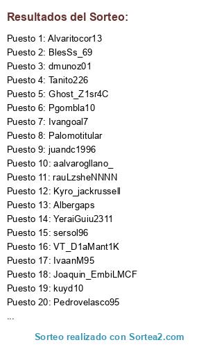 Lista de participantes: VT_Energetik, peppuz07, Traifor_ESP, Blesita69, YeraiGuiu2311, rauLzsheNNNN, sersol96, Tanito226, Kyro_jackrussell, Joaquin_EmbiLMCF, BlesSs_69, Alvaritocor13, kuyd10, Albergaps, Pgombla10, Ivangoal7, aalvarogllano_, Pedrovelasco95, Ghost_Z1sr4C, Palomotitular, dmunoz01, juandc1996, VT_D1aMant1K, IvaanM95.