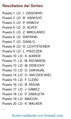 Lista de participantes: LD P. LAHM, LD D. ALVES, LD DANILO, LD L. PISZCZEK, LD S. LICHTSTEINER, LD G. VAN DER WIEL, LD B. IVANOVIĆ, LD F. CLERC, LD P. ZABALETA, LD N. CLYNE, LD D. CARVAJAL, LD Z. MIKULANEC, LD JUANFRAN, LD B. SAGNA, LD M. DEBUCHY, LD C. MAGGIO, LD M. RICHARDS, LD I. CISSOKHO, LD H. FABINHO, LD S. AURIER, LD J. GÁMEZ, LD MAICON, LD S. COLEMAN, LD RAFINHA, LD M. PEREIRA, LD P. NINKOV, LD D. JANMAAT, LD K. WALKER, LD MÁRIO FERNANDES, LD I. ABATE.