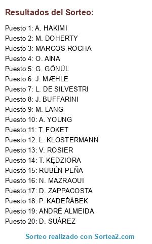 Lista de participantes: L. KLOSTERMANN, M. DOHERTY, D. ZAPPACOSTA, J. BUFFARINI, J. MÆHLE, A. HAKIMI, ANDRÉ ALMEIDA, G. GÖNÜL, RUBÉN PEÑA, O. AINA, D. SUÁREZ, M. LANG, T. FOKET, A. YOUNG, P. KADEŘÁBEK, N. MAZRAOUI, MARCOS ROCHA, T. KĘDZIORA, L. DE SILVESTRI, V. ROSIER.