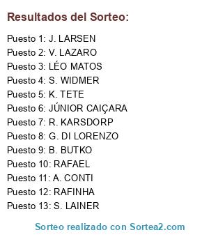 Lista de participantes: JÚNIOR CAIÇARA, D. ZEEFUIK, A. BAMBA, V. LAZARO, N. CLYNE, M. LINNES, B. BUTKO, J. LARSEN, S. KLAIBER, D. BOCANEGRA, B. BERESZYŃSKI, Y. SABALY, A. CONTI, JUAN ANGULO, S. WIDMER, G. DI LORENZO, ZALDÚA, RAFINHA, M. DARMIAN, JUANFRAN, H. TRAORÉ, S. LAINER, RAFAEL, R. KARSDORP, S. PETROV, K. TETE, MIGUELÓN, S. ALAKOUCH, J. TAVERNIER, LÉO MATOS, G. MONTIEL.
