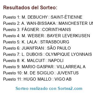 Lista de participantes: K. MALCUIT NAPOLI, FÁGNER CORINTHIANS, HUGO MALLO VIGO AB, M. WEISER BAYER LEVERKUSEN, M. DEBUCHY SAINT-ÉTIENNE, MARIO GASPAR VILLARREAL A, M. DE SCIGLIO JUVENTUS, A. WAN-BISSAKA MANCHESTER UNITED, JUANFRAN SÃO PAULO, K. LALA STRASBOURG, L. DUBOIS OLYMPIQUE LYONNAIS.