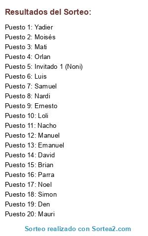 Lista de participantes: Loli, Den, Orlan, Moisés, Manuel, Emanuel, Mauri, Nardi, Nacho, Samuel, Ernesto, Luis, Noel, Brian, David, Simon, Mati, Parra, Yadier, Invitado 1 (Noni), Invitado 2.