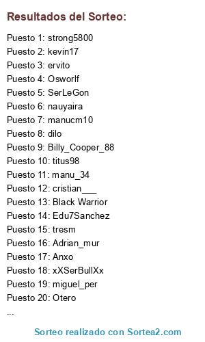 Lista de participantes: Adrian_ct1995, Osworlf, strong5800, Anxo, Otero, titus98, manucm10, cristian___, Serluis20_2, dilo, Adrian_mur, Black Warrior, thegameAJSD, miguel_per, pedroncillo, juanje, ervito, jemi666, kevin17, chusco83, Billy_Cooper_88, manu_34, Esteve84, Edu7Sanchez, tresm, nauyaira, Eduardito, dailetc, xXSerBullXx, Sesan, SerLeGon, treach.