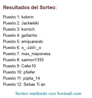 Lista de participantes: kolorin, emijuansolo, Sebas Ti an, max_mayonesa, saimon1393, gañanho, Cebo10, pipita_14, Jackiekiki, o_-JaVi-_o, pfeifer, kornich.