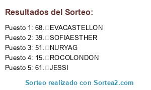 Lista de participantes: 1. ESTELBLAU, 2. LA MODA Y LA BELLEZA, 3. LA MODA Y LA BELLEZA, 4. GADIRROJA, 5. GADIRROJA, 6. KAZU, 7. PERLICA84, 8. PERLICA84, 9. EVAFR, 10. AYDITA, 11. LITTLE, 12. NURIA, 13. NURIA, 14. TANYA, 15. EL RINCON DE TRIZ, 16. EL RINCON DE TRIZ, 17. 7PENSAMIENTOS, 18. 7PENSAMIENTOS, 19. BEATRIZ ESCRIBANO, 20. AIRUN, 21. ROCIPICI, 22. ROCIPICI, 23. MSEVILLA, 24. KELIKA, 25. RAQUEL G, 26. RAQUEL G, 27. MARIQUITITAS ROJAS, 28. MARIQUITITAS ROJAS, 29. NURIA TORRENTA, 30. LUNA BLANCA, 31. LORENA, 32. ANIÑA, 33. ANIÑA, 34. ANYOLCOCINA, 35. ANYOLCOCINA, 36. BEGON69, 37. BEGON69, 38. LSEIJO, 39. SALANDER, 40. SALANDER, 41. MARIADELG, 42. PALAPA, 43. MONTSE PRIETO, 44. PAZ AMOR, 45. NGALLARDON, 46. PLALIMENTACION, 47. CONFALDASYALOLOCO, 48. JUDYM, 49. CHICA, 50. CHICA, 51. ANAE, 52. LARY, 53. NOAH, 54. ELENUSQUI, 55. MIAVI, 56. MIAVI, 57. ROCIO POTIS Y COSITAS, 58. ROCIO POTIS Y COSITAS, 59. MARIA, 60. ISABEL GRAGERA, 61. SUNSHINE, 62. SUNSHINE, 63. GATITA82, 64. LA NENITA, 65. ELENITA, 66. LPJAVALOYES, 67. LUNAENTERA, 68. MARIA JOSE, 69. MIERIANROCU, 70. ENARA GIRL, 71. ENARA GIRL, 72. NURIA TRABAJOMUCHO, 73. NURIA TRABAJOMUCHO, 74. BEATRIZ VALDES, 75. JARF8, 76. LOLA ANTON, 77. BABYCOSMETICS, 78. SUSANA.