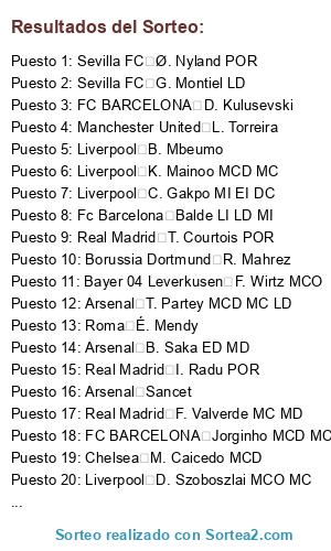 Lista de participantes: Real Madrid E. Haaland DC, Liverpool Rodri MCD MC, Roma M. Salah, Real Madrid J. Bellingham MCO MC, Real Madrid Vini Jr. EI DC, Manchester City K. De Bruyne MC MCO, Bayer 04 Leverkusen F. Wirtz MCO, Real Madrid T. Courtois POR, Chelsea V. van Dijk DFC, Manchester United R. Lewandowski DC, Fc Barcelona M. ter Stegen POR, Liverpool Alisson POR, Real Madrid F. Valverde MC MD, Manchester City C. Palmer MCO MD, Bayer 04 Leverkusen A. Rüdiger DFC, Arsenal B. Saka ED MD, Arsenal M. Ødegaard MC, Manchester City P. Foden ED EI MCO, Paris Saint-Germain W. Saliba DFC, Manchester City Ruben Dias DFC, Manchester City Theo Bernard François Hernandez, Paris Saint-Germain G. Donnarumma POR, Paris Saint-Germain Marquinhos DFC, Arsenal Gabriel DFC, Paris Saint-Germain N. Barella MC MCD, Fc Barcelona J. Musiala MCO MI MC, Real Madrid J. Tah DFC, Manchester City Ederson POR, Chelsea V. Osimhen, Real Madrid Rodrygo ED DC, Fc Barcelona Pedri MC EI, Manchester City A. Isak, Fc Barcelona J. Kounde LD DFC, Fc Barcelona F. de Jong MC MCD, Liverpool A. Mac Allister MC MCD, Liverpool T. Alexander-Arnold LD, Manchester City Bernardo Silva MC ED, Arsenal Bremer DFC, Borussia Dortmund G. Kobel POR, Borussia Dortmund L. Modric MC MCO MCD, Manchester City Heung-Min Son, Bayer 04 Leverkusen Grimaldo MI LI, Real Madrid Carvajal LD, Sevilla FC K. Benzema, Paris Saint-Germain O. Dembele ED MCO, Fc Barcelona Raphinha ED EI MD, Paris Saint-Germain Vitinha MC MCD, Fc Barcelona R. Araujo DFC LD, Real Madrid A. Tchouameni MCD MC DFC, Chelsea M. Caicedo MCD, Real Madrid eder Militao DFC, Roma L. Openda, Paris Saint-Germain A. Hakimi LD, Borussia Dortmund N. Schlotterbeck DFC, Arsenal Bruno Guimaraes, Liverpool Dani Olmo, Bayer 04 Leverkusen Diogo Jota DC EI, Liverpool L. Diaz MI EI, Liverpool Rafael Leao EI MI DC, Arsenal David Raya POR, Chelsea G. Mamardashvili, Real Madrid D. Alaba DFC LI, Borussia Dortmund N. Kanté, Borussia Dortmund R. Mahrez, Bayer 04 Leverkusen S. Tonali, Real Madrid J. Frimpong, Manchester City J. Gvardiol LI DFC, Bayer 04 Leverkusen E. Palacios MC MCD, Liverpool I. Konate DFC, Paris Saint-Germain A. Lookman, Arsenal B. White LD, Paris Saint-Germain M. Thuram DC, Arsenal Mikel Merino MC MCO, Manchester City M. Akanji DFC, Manchester City N. Ake DFC LI, Paris Saint-Germain J. Brandt MCO MD MC, Manchester City J. Stones DFC MCD LD, Real Madrid K. Coman MI MD, Manchester United A. Onana POR, Manchester City İ. Gündoğan MC MCD, Roma M. Hummels DFC, Liverpool F. Acerbi DFC, Sevilla FC Iago Aspas, FC BARCELONA D. Kulusevski, Chelsea X. Simons, Borussia Dortmund Pedro Gonçalves, Fc Barcelona Lamine Yamal ED EI, Real Madrid E. Camavinga MC MCD LI, Roma C. Nkunku MCO DC, Paris Saint-Germain Nuno Mendes LI, Liverpool C. Gakpo MI EI DC, Bayer 04 Leverkusen Pedro Porro, Fc Barcelona B. Kamara MCD MC, Manchester United M. de Ligt DFC, FC BARCELONA Marc Cucurella LI, Arsenal A. Dovbyk DC, Bayer 04 Leverkusen T. Koopmeiners MC MCO, Manchester United L. Martinez DFC, Real Madrid R. De Paul MC MCD, Bayer 04 Leverkusen Aleix Garcia MC MCD, Arsenal L. Trossard EI DC, Real Madrid F. Mendy LI, Manchester City M. Kovačic MC MCD, Bayer 04 Leverkusen P. Schick DC, Manchester United L. Torreira, Chelsea K. Koulibaly, Borussia Dortmund M. Sabitzer MC MCO MCD, Liverpool A. Robertson LI, Borussia Dortmund G. Di Lorenzo LD DFC, Roma G. Mancini DFC, Bayer 04 Leverkusen R. Andrich MCD MC DFC, Arsenal T. Partey MCD MC LD, Bayer 04 Leverkusen L. Hradecký POR, Bayer 04 Leverkusen A. Gordon, Liverpool M. van de Ven, Arsenal Sancet, Arsenal M. Diaby, Borussia Dortmund Y. En-Nesyri, Manchester City M. Zaccagni, Fc Barcelona Savinho EI ED, Paris Saint-Germain B. Barcola EI ED, Fc Barcelona Balde LI LD MI, Chelsea E. Fernandez MC MCD, Fc Barcelona J. David, Liverpool R. Gravenberch MCD MC, Borussia Dortmund D. Udogie, Arsenal Gabriel Martinelli EI MI, Manchester United D. Nuñez DC, Arsenal P. Hincapie DFC LI, Chelsea R. James LD, Manchester United Diogo Dalot LI LD, Real Madrid A. Correa DC MD, Sevilla FC L. Pellegrini MCO MC, Bayer 04 Leverkusen E. Tapsoba DFC, Manchester City K. Walker LD, Roma S. Gnabry MD MI DC, Borussia Dortmund D. Zapata, Sevilla FC Iñigo Martinez DFC, Sevilla FC K. Mitoma, Liverpool B. Mbeumo, Paris Saint-Germain Joao Neves MC MCD, Sevilla FC D. Frattesi MC MCO, Fc Barcelona F. Kadıoğlu, Paris Saint-Germain R. Kolo Muani DC, Liverpool D. Szoboszlai MCO MC, Chelsea Joao Felix MCO MI DC, Real Madrid A. Lunin POR, Manchester United A. Saint-Maximin, Sevilla FC R. Loftus-Cheek MC MCO, Manchester United N. Mazraoui LD LI, Manchester United Casemiro MCD MC, Arsenal Gabriel Jesus DC, Borussia Dortmund W. Anton DFC, Borussia Dortmund N. Süle DFC LD, Chelsea B. Henrichs, FC BARCELONA Jorginho MCD MC, Manchester City S. Ortega POR, Paris Saint-Germain D. Malen, Roma F. Kessié, Manchester City W. Zaïre-Emery MC MCD, Real Madrid J. Doku EI ED, Chelsea M. Gusto LD, Paris Saint-Germain W. Pacho DFC, Liverpool C. Jones MC MCO MCD, Roma J. Timber LD LI DFC, Borussia Dortmund F. Nmecha MCD MC, Manchester United L. Shaw LI DFC, Sevilla FC Suso MD MCO MC, Manchester United H. Maguire DFC, Arsenal Javi Galan LI MI, Chelsea T. Kleindienst, Sevilla FC J. Gomez DFC LD LI, Bayer 04 Leverkusen J. Hofmann MCO DC, Roma É. Mendy, Sevilla FC Mario Hermoso DFC, Sevilla FC M. Taremi DC, Borussia Dortmund J. Gittens EI MI, Sevilla FC D. Doue EI MC, Arsenal J. Musso POR, Manchester United Amad ED MCO MD, Chelsea L. Colwill DFC, Chelsea N. Madueke MD, Manchester City Samuel Lino MI EI, Chelsea Pedro Neto MD MI, Chelsea W. Fofana DFC, Bayer 04 Leverkusen D. Lukebakio ED MD DC, Roma E. Ndicka DFC, Borussia Dortmund J. Ryerson LD LI, Bayer 04 Leverkusen N. Mukiele LD DFC MD, Borussia Dortmund R. Bensebaini LI DFC, Arsenal R. Sterling MI MD, Roma S. El Shaarawy MI EI MCO, Liverpool M. Perin POR, Sevilla FC F. Muslera, Chelsea Alejandro Garnacho EI MI MD, Liverpool H. Elliott MCO MC ED, Sevilla FC D. Sow MC MCD, Liver