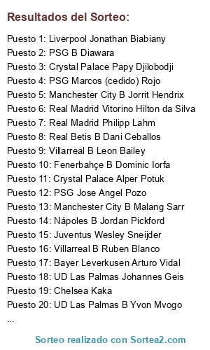 Lista de participantes: AC Milán Rafael Silva, AC Milán Jeremy Mathieu, AC Milán Pedro Rodriguez Ledesma, AC Milán Ross Barkley, AC Milán Nani, AC Milán Sven Bender, AC Milán Donis Avdijaj, AC Milán Andrés Guardado, AC Milán Christian Benteke, AC Milán Jan Vertonghen, AC Milán Stefan De Vrij, AC Milán Kevin Volland, AC Milán Bojan Krkic, AC Milán Fabinho, AC Milán Asmir Begovic, AC Milán Tim Krul, AC Milán Nacho Monreal, AC Milán Cesar Azpilicueta, AC Milán Ivan Perisic, Arsenal Julio Cesar, Arsenal Andrea Consigli, Arsenal Bruno Peres, Arsenal Jetro Willems, Arsenal Stefan Radu, Arsenal Andrea Barzagli, Arsenal Frank Fabra, Arsenal Cheikhou Kouyate, Arsenal Manuel Fernandes, Arsenal Tomas Kalas, Arsenal Marlos Romero Bonfim, Arsenal Paul-Georges Ntep, Arsenal Yacine Brahimi, Arsenal Karim Bellarabi, Arsenal Ángel Correa, Arsenal Darlington Nagbe, Arsenal Mauro Zárate, Arsenal (cedido)Ricardo Quaresma, Arsenal Kevin Mirallas, Arsenal Miguel Borja, Arsenal Jesús Fernández, Arsenal Nordin Amrabat, Arsenal B Alban Lafont, Arsenal B Edmilson Junior, Arsenal B Jeisson Vargas, Arsenal B Solomon Kverkvelia, Arsenal B Josh Onomah, Arsenal B Amin Younes, Arsenal B Cameron Borthwick-Jackson, Arsenal B Christian Pulisic, Arsenal B Alex Iwobi, Arsenal B Kieran Tierney, Arsenal B Leo Bonatini, Arsenal B Luca Lezzerini, Arsenal B Davinson Sanchez, Arsenal B Saidy Janko, Arsenal B Jean-Kevin Augustin, Arsenal B Daniele Verde, Arsenal B Kylian Mbappe Lottin, Arsenal B Tammy Abraham, Arsenal B Mohammed Elyounoussi, Arsenal B Godfred Donsah, Arsenal B Sergio Díaz, Arsenal B Derrick Luckassen, Arsenal B Bruno Fernandes, Arsenal B Lorenzo Callegari, Arsenal B Edwin Cardona, Atlético de Madrid Vicente Guaita, Atlético de Madrid Marcel Schmelzer, Atlético de Madrid Dani Alves, Atlético de Madrid Laurent Koscielny, Atlético de Madrid Georginio Wijnaldum, Atlético de Madrid Javi Martinez, Atlético de Madrid Oguzhan Ozyakup, Atlético de Madrid Mateo Musacchio, Atlético de Madrid Thomas Muller, Atlético de Madrid José Callejón, Atlético de Madrid Quincy Promes, Atlético de Madrid Kevin Strootman, Atlético de Madrid Douglas Costa, Atlético de Madrid Anthony Martial, Atlético de Madrid Jesus Corona, Atlético de Madrid Moussa Sissoko, Atlético de Madrid Roberto Firmino, Atlético de Madrid Aaron Lennon, Atlético de Madrid Jeremain Lens, Atlético de Madrid Ciro Immobile, Atlético de Madrid Thibaut Courtois, Atlético de Madrid Moussa Marega, Bayer Leverkusen Jose Vazquez, Bayer Leverkusen Jonas, Bayer Leverkusen Steve Mandanda, Bayer Leverkusen Shinji Kagawa, Bayer Leverkusen Andoni Iraola, Bayer Leverkusen Giuseppe Rossi, Bayer Leverkusen Marcelo (DFC), Bayer Leverkusen Darijo Srna, Bayer Leverkusen Arturo Vidal, Bayer Leverkusen (cedido) Mario Mandzukic, Bayer Leverkusen Victor Valdes, Bayer Leverkusen Thiago Alcantara, Bayer Leverkusen Marvell Wynne, Bayer Leverkusen Juan Manuel Mata, Bayer Leverkusen Frank Ribery, Bayer Leverkusen Lass (cedido) Diarra, Bayer Leverkusen Vincent (cedido) Janssen, Bayer Leverkusen Rubén (cedido) Semedo, Borussia Dortmund Jaineil Hoilet, Borussia Dortmund Neven Subotic, Borussia Dortmund Emilio Nsue, Borussia Dortmund Andre Schürrle, Borussia Dortmund Rui Patricio, Borussia Dortmund James Rodriguez, Borussia Dortmund Fernando Llorente, Borussia Dortmund Ron-Robert Zieler, Borussia Dortmund Jeremy Menez, Borussia Dortmund Diogo Figueiras, Borussia Dortmund Patrick Van Aanholt, Borussia Dortmund Cedrick Mabwati Gerard, Borussia Dortmund Jesus Navas, Borussia Dortmund Mapou Yanga-Mbiwa, Borussia Dortmund Kévin Gameiro, Borussia Dortmund Florentin Pogba, Borussia Dortmund Victor Ibarbo, Borussia Dortmund Clinton N'Jie, Borussia Dortmund Cheik Tiote, Chelsea Paul Pogba, Chelsea Miguel Layún, Chelsea Jefferson, Chelsea Memphis Depay, Chelsea Joe Hart, Chelsea Jeremy Toulalan, Chelsea Kyriakos Papadopoulos, Chelsea Shkodran Mustafi, Chelsea Roberto Soriano, Chelsea Riyad Mahrez, Chelsea Kaka, Chelsea Manolo Gabbiadini, Chelsea Aiden Mcgeady, Chelsea Remy Cabella, Chelsea Jesé Rodriguez, Chelsea Diego Benaglio, Chelsea Sergio Ramos, Chelsea Seamus Coleman, Chelsea Zatlan Ibrahimovic, Chelsea Yannick Ferreira Carrasco, Chelsea B Carlos Strandberg, Chelsea B Aldo Kalulu, Chelsea B Kevin Balanta, Chelsea B Juan Muñoz, Chelsea B Sasa Lukic, Chelsea B Wanderson, Chelsea B Angus Gunn, Chelsea B Alex Remiro, Chelsea B Dzhamaldin Khodzhaniyazov, Chelsea B Callum Paterson, Chelsea B Carlos Blanco, Chelsea B Kasey Palmer, Chelsea B Zinedine Machach, Chelsea B Anthony Ribelin, Chelsea B Aaron Leya Iseka, Chelsea B Oleksandr Zinchenko, Chelsea B Kaan Ayhan, Chelsea B Brandon Barker, Crystal Palace Stephan El Shaarawy, Crystal Palace Sven Ulreich, Crystal Palace Pablo Armero, Crystal Palace Dorlan Pabón, Crystal Palace Brice Dja Djedjé, Crystal Palace Jackson Martinez, Crystal Palace Nedum Onuoha, Crystal Palace Marc Bartra, Crystal Palace Vlad Chiriches, Crystal Palace Cesc Fabregas, Crystal Palace Lazar Markovic, Crystal Palace Michael Arroyo, Crystal Palace Jeffersson Montero, Crystal Palace Steven Gerrard, Crystal Palace Luuk De Jong, Crystal Palace Sabri Sarioglu, Crystal Palace Papy Djilobodji, Crystal Palace Alper Potuk, Crystal Palace Simao Mate, Crystal Palace Aritz Aduriz, Crystal Palace Clement Grenier, Crystal Palace Fernando Muslera, Crystal Palace Yasser Al Shahrani, FC Barcelona Lars Stindl, FC Barcelona Nicolas Gaitan, FC Barcelona Yohan Cabaye, FC Barcelona Benjamin Moukandjo, FC Barcelona Konstantinos Manolas, FC Barcelona Cristian Ansaldi, FC Barcelona Aymen Abdennour, FC Barcelona Cristian Eriksen, FC Barcelona Manuel Locatelli, FC Barcelona Filippo Romagna, FC Barcelona Stephane Ruffier, FC Barcelona Carlos Darwin Quintero, FC Barcelona Carlos Vela, FC Barcelona Luis Suarez, FC Barcelona Luan, FC Barcelona Adem Ljajic, FC Barcelona Gary Cahill, FC Barcelona Granit Xhaka, FC Barcelona Fabian Orellana, FC Barcelona Simon Mignolet, 