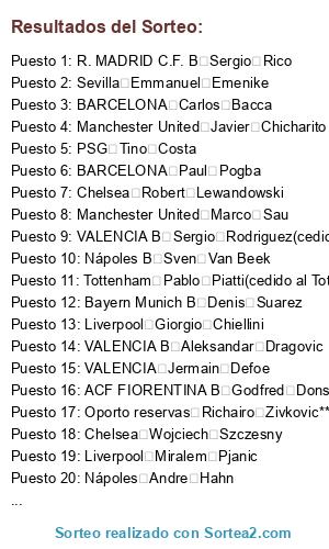Lista de participantes: AC Milán Ashley Cole, AC Milán Obafemi Martins, AC Milán Mauro Zarate, AC Milán Aaron Lennon, AC Milán Tim Krul, AC Milán Kevin Volland, AC Milán Asmir Begovic, AC Milán Jan Vertonghen, AC Milán Jeremy Mathieu, AC Milán Camilo Zuñiga, AC Milán Andrés Guardado, AC Milán Soldado, AC Milán Fabricio Coloccini, AC Milán Jefferson Farfan, AC Milán Younés Kaboul, AC Milán Nacho Monreal, AC Milán Kevin Mirallas, AC Milán Antonio Candreva, AC Milán Oussama Assaidi, AC Milán Sven Bender, ACF FIORENTINA Cristian Zapata, ACF FIORENTINA José Callejón, ACF FIORENTINA Franck Ribery, ACF FIORENTINA Aymeric Laporte, ACF FIORENTINA Gokhan Gonul, ACF FIORENTINA Kevin Strootman, ACF FIORENTINA Angel Di Maria, ACF FIORENTINA Lora, ACF FIORENTINA Maximiliano Moralez, ACF FIORENTINA Luiz Gustavo, ACF FIORENTINA Roberto Firmino, ACF FIORENTINA Daniel Agger, ACF FIORENTINA Dzeko, ACF FIORENTINA Naldo, ACF FIORENTINA Xherdan Shaqiri, ACF FIORENTINA Danilo, ACF FIORENTINA Claudio Bravo, ACF FIORENTINA Thiago Motta, ACF FIORENTINA Keylor Navas, ACF FIORENTINA Mapou Yanga-Mbiwa, ACF FIORENTINA Dani Parejo, ACF FIORENTINA Aritz Aduriz, ACF FIORENTINA Roman Burki, ACF FIORENTINA Mario Mandzukic, ACF FIORENTINA B Godfred Donsah, ACF FIORENTINA B Gabriel Castellon, ACF FIORENTINA B Anthony Martial, ACF FIORENTINA B Alex Serrano, ACF FIORENTINA B Jonathan Tah, ACF FIORENTINA B Shawn Parker, ACF FIORENTINA B Lass Bangoura, ACF FIORENTINA B Christian Clemens, ACF FIORENTINA B Carlos Castro, ACF FIORENTINA B Frederik Sorensen, ACF FIORENTINA B Pablo Perez, ACF FIORENTINA B Dani Ndi, ACF FIORENTINA B Pedro Obiang, ACF FIORENTINA B Borja Lopez, ACF FIORENTINA B Timo Horn, ACF FIORENTINA B Juan Muñiz, ACF FIORENTINA B Yossuf Poulsen, ACF FIORENTINA B Fraser Kerr, Arsenal Ciro Immobile, Arsenal Philippe Mexes, Arsenal Norberto Neto, Arsenal Carlos Tevez, Arsenal Pepe, Arsenal Ivica Olic, Arsenal Roman Weidenfeller, Arsenal Felipe Melo, Arsenal Philippe Coutinho, Arsenal Alex Rodrigo Diaz da Costa, Arsenal Cristian Zaccardo, Arsenal Carlos Peña, Arsenal Jermaine Jones, Arsenal Alex Telles, Arsenal Francesco Totti, Arsenal Stephan Lichtsteiner, Arsenal Mohamed Salah, Arsenal Aurelien Chedjou, Arsenal Hugo Campagnaro, Arsenal Juan Arango, Arsenal Serge Gakpe, Arsenal Mubarak Wakaso, Arsenal Andre Ayew, ATLÉTICO MADRID Thibaut Courtois, ATLÉTICO MADRID Jose Manuel Fernandez, ATLÉTICO MADRID Arda Turan, ATLÉTICO MADRID Ander Herrera, ATLÉTICO MADRID Jonathan Biabiany, ATLÉTICO MADRID Konstantine Rausch, ATLÉTICO MADRID Fernando Torres, ATLÉTICO MADRID Raheem Sterling, ATLÉTICO MADRID Jonathan Dos Santos, ATLÉTICO MADRID Emilio Nsue, ATLÉTICO MADRID Artur Moraes, ATLÉTICO MADRID Pedro Rodriguez, ATLÉTICO MADRID Oliver Giroud, ATLÉTICO MADRID Laurent Koscielny, ATLÉTICO MADRID Klaas-Jan Huntelaar, ATLÉTICO MADRID Dries Mertens, ATLÉTICO MADRID Steven Caulker, ATLÉTICO MADRID Lazar Markovic, ATLÉTICO MADRID Derick Tshimanga, ATLÉTICO MADRID Kolo Toure, ATLÉTICO MADRID Veli Kavkak, ATLÉTICO MADRID Ander Iturraspe, ATLÉTICO MADRID Andres Iniesta, BARCELONA Oscar dos Santos, BARCELONA Paul Pogba, BARCELONA Nicolas Gaitan, BARCELONA Aymen Abdennour, BARCELONA Simon Mignolet, BARCELONA Marco Verratti, BARCELONA Nicolas N'koulou, BARCELONA Jesus Gamez, BARCELONA Gaston Ramirez, BARCELONA Thorgan Hazard, BARCELONA Adan Lallana, BARCELONA Artem Dzyuba, BARCELONA Cristian Eriksen, BARCELONA Yohan Cabaye, BARCELONA Rio Mavuba, BARCELONA Stephane Ruffier, BARCELONA Cristian Ansaldi, BARCELONA Gary Cahill, BARCELONA Nathaniel Clyne, BARCELONA Stefan Radu, BARCELONA Carlos Darwin Quintero, BARCELONA Carlos Bacca, BARCELONA Taison Barcellos Freda, Bayern Leverkusen Andre Carrillo, Bayern Leverkusen Zacaria Labyad, Bayern Leverkusen Fabio Coentrao, Bayern Leverkusen Tiago Cardoso Mendes, Bayern Leverkusen Giuseppe Rossi(cedido al Leverkusen Temp X), Bayern Leverkusen Andrea Barzagli(cedido al Leverkusen Temp X), Bayern Leverkusen Jakub Blaszczykowski, Bayern Leverkusen Joao Moutinho, Bayern Leverkusen Glen Johnson, Bayern Leverkusen Antonio Valencia, Bayern Leverkusen Henrikh Mkhitaryan, Bayern Leverkusen Ruben Garcia, Bayern Leverkusen Victor Valdes, Bayern Leverkusen Tolga Zengin, Bayern Leverkusen Sergio Ramos, Bayern Leverkusen Shinji Kagawa, Bayern Leverkusen Mathieu Valbuena, Bayern Munich Stefan Savic, Bayern Munich Vicente Guaita, Bayern Munich Joel Matip, Bayern Munich Javier Mascherano, Bayern Munich Koke, Bayern Munich Willian Borges da silva, Bayern Munich Pablo Zabaleta, Bayern Munich Gerard Deulofeu, Bayern Munich Ola John, Bayern Munich Asier Illarramendi, Bayern Munich Lucas Moura Da Silva, Bayern Munich Alberto Moreno, Bayern Munich Samuel Etoo, Bayern Munich Mario Gotze, Bayern Munich Jordi Alba, Bayern Munich Robin van Persie(cedido al Bayern Temp X), Bayern Munich Gerard Pique, Bayern Munich David De Gea, Bayern Munich Daniel Sturridge, Bayern Munich Keita Balde diao, Bayern Munich B Adama Traore, Bayern Munich B Jeronimo Rulli, Bayern Munich B Theo Bongonda, Bayern Munich B Joao Cancelo, Bayern Munich B Sergi Roberto, Bayern Munich B Felipe Augusto, Bayern Munich B Carles Planes, Bayern Munich B Antonio Sanabria, Bayern Munich B Oliver Torres, Bayern Munich B Frank Bagnack, Bayern Munich B Jean Marie Dongou, Bayern Munich B Ruben Vezo, Bayern Munich B Joseph Minala, Bayern Munich B Munir El Haddadi, Bayern Munich B Gedion Zelalem, Bayern Munich B Gianluca Gaudino, Bayern Munich B Denis Suarez, Bayern Munich B Federico Vico Villegas, Bayern Munich B Edgar Ié, Bayern Munich B Bruno Zuculini, Bayern Munich B Fabrice Ondoa, BETIS Ruben Castro, BETIS Joel Campbell, BETIS Ivan Perisic, BETIS Juan Bernat, BETIS Maxime Gonalons, BETIS Seamus Coleman, BETIS James Rodriguez, BETIS Daniele De Rossi, BETIS Leroy Fer, BETIS Michel Vorm, BETIS Edinson Cavani, BETIS Eliaquim Mangala, BETIS Beñat Etxebarria, BETIS Marc Bartra, BETIS Joaquin Sanchez, BETIS Bruno Alves, BE
