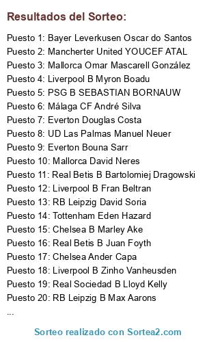 Lista de participantes: Chelsea Miguel Moyá, Chelsea Joao Moutinho, Chelsea Fabian Castillo, Chelsea Yannick Ferreira Carrasco, Chelsea Matthias Ginter, Chelsea Zlatko Junuzovic, Chelsea Idrissa Gueye, Chelsea Antonio Latorre, Chelsea Alex Oxlade-Chamberlain, Chelsea Angello Stiller, Chelsea Rubén Sobrino, Chelsea Miranda, Chelsea Bernd Leno, Chelsea Arthur Masuaku, Chelsea Ander Capa, Chelsea Martín Montoya, Chelsea Cristian Portugués, Chelsea Quincy Promes, Chelsea Marcel Sabitzer, Chelsea Georgiy Dzhikiya Dzhikiya, Chelsea Jason Denayer, Chelsea Henry Onyekuru, Chelsea Wissam Ben Yedder, Chelsea Ryan Fredericks, Chelsea Alban Lafont, Chelsea B Brenden Aaronson, Chelsea B Tomas Tavarés, Chelsea B Marcel Ruiz, Chelsea B Lutsharel Geertruida, Chelsea B Khephren Thuram, Chelsea B Yacine Adli, Chelsea B Joelson Fernandes, Chelsea B Angel Fortuño, Chelsea B Filip Jorgensen, Chelsea B Marley Ake, Chelsea B Alhassan Yusuf, Chelsea B guilherme pato, Chelsea B Nathan Ferguson, Chelsea B Iker losada, Chelsea B Ismael Casas, Chelsea B Jonathan Panzo, Chelsea B Michael Olise, Chelsea B Odilon Kossounou, Chelsea B Emin Bayram, Chelsea B Kevin Boma, Chelsea B Benjamin Sesko, Chelsea B Noah Okafor, Chelsea B Million Manhoef, Chelsea B Bartlomiej Mruk, Chelsea B Largie Ramazani, Atlético de Madrid Allan Saint-Maximim, Atlético de Madrid Renato Sanches, Atlético de Madrid Tyronne Ebuehi, Atlético de Madrid Mikel Oyarzabal, Atlético de Madrid Rick Karsdorp, Atlético de Madrid Tyler Adams, Atlético de Madrid Ángel Martín Correa, Atlético de Madrid Bruno Fernandes, Atlético de Madrid Tomas Lemar, Atlético de Madrid Ramy Bensebaini, Atlético de Madrid Gerard Deulofeu, Atlético de Madrid Saul Ñiguez, Atlético de Madrid Sergio Ramos, Atlético de Madrid Anthony Martial, Atlético de Madrid Clement Lenglet, Atlético de Madrid Sergio Reguilón, Atlético de Madrid RAPHAEL GUERREIRO, Atlético de Madrid Marcus Rashford, Atlético de Madrid Thibaut Courtois, Atlético de Madrid Kevin Trapp, Atlético de Madrid Yves Bissouma, Atlético de Madrid joao felix, Atlético de Madrid Romelu Lukaku, Atlético de Madrid B luis sinisterra, Atlético de Madrid B Emile Smith Rowe, Atlético de Madrid B Pedro De la Vega, Atlético de Madrid B Sekou koita, Atlético de Madrid B maarten vandevoordt, Atlético de Madrid B Ronaldo Vieira, Atlético de Madrid B Sergio Camello, Atlético de Madrid B Mitchell van Bergen, Atlético de Madrid B Christian Früchtl, Atlético de Madrid B Blas Riveros, Atlético de Madrid B Charles De Ketelaere, Atlético de Madrid B Kristoffer Ajer, Atlético de Madrid B Iñigo Córdoba, Atlético de Madrid B Marcus Tavernier, Atlético de Madrid B Timothy Weah, Atlético de Madrid B Perr Schuurs, Atlético de Madrid B Victor Mollejo, Atlético de Madrid B Yann Karamoh, Atlético de Madrid B Jeremy Doku, Atlético de Madrid B mohammed kudus, Atlético de Madrid B Jonathan Amon, Atlético de Madrid B chris richards, Atlético de Madrid B Devyne Rensch, Atlético de Madrid B morgan gibbs-white, Bayer Leverkusen Everton Soares, Bayer Leverkusen Josip Illicic, Bayer Leverkusen Alexander Kolarov, Bayer Leverkusen Djene Dakoman, Bayer Leverkusen Marcos Acuña, Bayer Leverkusen Federico (Fred) Rodrguez, Bayer Leverkusen Radja Nainggolan, Bayer Leverkusen Sergio Canales, Bayer Leverkusen ROBIN GOSENS, Bayer Leverkusen Jesus Corona, Bayer Leverkusen Samir Handanovic, Bayer Leverkusen Antonio Adan, Bayer Leverkusen Íker Muniain, Bayer Leverkusen Hector Herrera, Bayer Leverkusen Oscar do Santos, Bayer Leverkusen Iago Aspas, Bayer Leverkusen Ciro Immobile, Bayer Leverkusen Nicolás Alejandro Tagliafico, Bayer Leverkusen Edin Visca, Real Sociedad IVAN RAKITIC, Real Sociedad Gareth Bale, Real Sociedad Filip Kostic, Real Sociedad Fran Echeampong, Real Sociedad FELIPE ANDERSON, Real Sociedad ALEX SANDRO, Real Sociedad Alex Teixeira, Real Sociedad Mário Figueira Fernandes, Real Sociedad NICOLAS DE LA CRUZ ARCOSA, Real Sociedad Marco Reus, Real Sociedad Yan Sommer, Real Sociedad FRANK ONYEKA, Real Sociedad José Paulo Paulinho, Real Sociedad GOZALO MONTIEL, Real Sociedad JORDAN LUKAKU, Real Sociedad Falaye Sacko, Real Sociedad Frank Fabra, Real Sociedad Aaron Wan-Bissaka, Real Sociedad Ederson Santana de Moraes, Real Sociedad CHIDERA EJUKE, Real Sociedad JEREMIAH ST.JUSTE, Real Sociedad Sergio Agüero, Real Sociedad RIDLE BOTE BAKU, Real Sociedad VIKTOR KOVALENKO, Real Sociedad B Markus Schubert, Real Sociedad B Gaëtan Poussin, Real Sociedad B TYLER MAGLOIRE, Real Sociedad B Lloyd Kelly, Real Sociedad B NAHUEL BUSTOS, Real Sociedad B MAURO JUNIOR, Real Sociedad B Ezri Konsa, Real Sociedad B Uros Racic, Real Sociedad B VLADYSLAV SUPRIAHA, Real Sociedad B Kevin Ruegg, Real Sociedad B ERIC GARCIA, Real Sociedad B DANIEL MALDINI, Real Sociedad B Crysencio SUMMERVILLE, Real Sociedad B IGNACIO ALISEDA, Real Sociedad B Luther Singh, Real Sociedad B Samuel Chukwueze, Real Sociedad B KONRAD DE LA FUENTE, Real Sociedad B GEORGIY TSITAISHVILI, Real Sociedad B CHISTIAN CONTEH, Real Sociedad B FERNANDO DOS SANTOS, Real Sociedad B ARVIN APPIAH, Real Sociedad B LEIF DAVIS, B.Dortmund Leon Bailey, B.Dortmund Matt Hummels, B.Dortmund Kylian Mbappe Lottin, B.Dortmund Alexander Isak, B.Dortmund Daniel Carvajal, B.Dortmund Jiri Pavlenka, B.Dortmund Pau Torres, B.Dortmund Paul Pogba, B.Dortmund Mario Gotze, B.Dortmund Axel Witsel, B.Dortmund Marek Hamsik, B.Dortmund Buffon, B.Dortmund Frank Ribery, B.Dortmund Hirving Lozano, B.Dortmund Sofyan Amrabat, B.Dortmund Karim Bellarabi, B.Dortmund Marquinhos, B.Dortmund Zlatan Ibrahimovic, B.Dortmund Yuri Berchiche, B.Dortmund Phil Foden, B.Dortmund B Sergio Gomez, B.Dortmund B Sofiane Diop, B.Dortmund B Lautaro Morales, B.Dortmund B Alan Velasco, B.Dortmund B Josep Martinez, B.Dortmund B Dujon Sterling, B.Dortmund B Enzo Millot, B.Dortmund B Roberto Piccoli, B.Dortmund B Sebastiano Esposito, B.Dortmund B Gonzalo Plata, B.Dortmund B Rabbi Matondo, B.Dortmund B Deiber Caiced