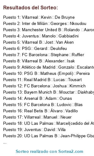 Lista de participantes: AC Milán Rafael Silva, AC Milán Yacine Brahimi, AC Milán Pedro Rodriguez Ledesma, AC Milán Ross Barkley, AC Milán Nani, AC Milán Sven Bender, AC Milán Donis Avdijaj, AC Milán Andrés Guardado, AC Milán Alexandre (cedido del PSG) Lacazette, AC Milán Christian Benteke, AC Milán Jan Vertonghen, AC Milán Stefan De Vrij, AC Milán Cedric Bakambu, AC Milán Danielle (cedido del ManU) De Rossi, AC Milán Ivan Perisic, AC Milán Fabinho, AC Milán Brice Dja Djedjé, AC Milán Gerónimo Rulli, AC Milán Tim Krul, AC Milán Nacho Monreal, AC Milán Cesar Azpilicueta, Arsenal Julio Cesar, Arsenal Asmir Begovic, Arsenal Bruno Peres, Arsenal Rafael Varane, Arsenal Cristian Portugues “Portu”, Arsenal Andrea Barzagli, Arsenal Luke Shaw, Arsenal Frank Fabra, Arsenal Florian(cedido del Roma) Thauvin, Arsenal Manuel Fernandes, Arsenal Paulinho, Arsenal Leon Goretzka, Arsenal Jefferson Farfán, Arsenal Marlos Romero Bonfim, Arsenal Luis Muriel, Arsenal Ángel Correa, Arsenal Yevhen Konoplyanka, Arsenal Miguel Almirón, Arsenal Bertrand Traoré, Arsenal Kylian Mbappe Lottin, Arsenal Jordi Mboula, Arsenal Yerri Mina, Arsenal B Alban Lafont, Arsenal B Edmilson Junior, Arsenal B Nico (cedido del City) Elvedi, Arsenal B Bingourou Kamara, Arsenal B Christian Pulisic, Arsenal B Edson Alvarez, Arsenal B Clement Lenglet, Arsenal B Antonio Barreca, Arsenal B Leo Bonatini, Arsenal B Jonathan Bamba, Arsenal B Saidy Janko, Arsenal B Jean-Kevin Augustin, Arsenal B Valentino Lázaro, Arsenal B John Murillo, Arsenal B Tammy Abraham, Arsenal B Mohammed Elyounoussi, Arsenal B Godfred Donsah, Arsenal B Adam Ounas, Arsenal B Cristian Pavón, Arsenal B Riccardo Orsolini, Arsenal B Yeferson Soteldo, Arsenal B Dominic Calvert-Lewin, Arsenal B Derrick Luckassen, Arsenal B Zakaria Bakkali, Arsenal B Bruno Fernandes, Atlético de Madrid Miguel Ángel Moya, Atlético de Madrid Alberto(cedido del Lazio) Moreno, Atlético de Madrid Dani Alves, Atlético de Madrid Arturo(cedido Las Palmas) Vidal, Atlético de Madrid Laurent Koscielny, Atlético de Madrid Thomas Muller, Atlético de Madrid Arda Turan, Atlético de Madrid Renato Sánches, Atlético de Madrid José Callejón, Atlético de Madrid Jesús Corona, Atlético de Madrid Iñaki Williams, Atlético de Madrid Jonathan Tah, Atlético de Madrid Aissa Mandi, Atlético de Madrid Anthony Martial, Atlético de Madrid Mathieu Valbuena, Atlético de Madrid David Silva, Atlético de Madrid Gonzalo Escalante, Atlético de Madrid Marco Reus, Atlético de Madrid Mariano Díaz, Atlético de Madrid Lucas Hernández, Atlético de Madrid Thibaut Courtois, Atlético de Madrid B Unai Simon, Atlético de Madrid B Justin Hoogma, Atlético de Madrid B Adrian Marin, Atlético de Madrid B Tyronne Ebuehi, Atlético de Madrid B Yves Bissouma, Atlético de Madrid B Sebastian Salazar, Atlético de Madrid B Ronaldo Vieira, Atlético de Madrid B Jonathan Ikone, Atlético de Madrid B Ewandro Felipe de Lima, Atlético de Madrid B Joao Carvalho, Atlético de Madrid B Jeando Fuchs, Atlético de Madrid B Tosin Adarabioyo, Atlético de Madrid B Blas Riveros, Atlético de Madrid B Mo El Hankouri, Atlético de Madrid B Thierry Ambrose, Atlético de Madrid B André Moreira, Atlético de Madrid B Panagiotis Retsos, Atlético de Madrid B Marlos Moreno, Atlético de Madrid B Marcelo Saracchi, Atlético de Madrid B Bruno Xadas, Atlético de Madrid B Han Kwang Song, Atlético de Madrid B Alexis Blin, Bayer Leverkusen Marc Bartra, Bayer Leverkusen Jonas, Bayer Leverkusen Steve Mandanda, Bayer Leverkusen Shinji Kagawa, Bayer Leverkusen Yaroslav Rakitsky, Bayer Leverkusen Lorenzo(cedido del PSG) Insigne, Bayer Leverkusen Omer Tropak, Bayer Leverkusen Marcelo (DFC), Bayer Leverkusen Darijo Srna, Bayer Leverkusen Ever Banega, Bayer Leverkusen Raffael, Bayer Leverkusen Marco Parolo, Bayer Leverkusen Samir Handanovic, Bayer Leverkusen Giuliano, Bayer Leverkusen Filipe Luis, Bayer Leverkusen Iago Aspas, Bayer Leverkusen David Abraham, Bayer Leverkusen Marvell Wynne, Bayer Leverkusen Juan Manuel Mata, Bayer Leverkusen Javier Pastore, Borussia Dortmund Mikel Oyarzabal, Borussia Dortmund Yuri Berchiche, Borussia Dortmund Gerard Pique, Borussia Dortmund Marcos Alonso, Borussia Dortmund Stefan Savic, Borussia Dortmund Alessandro Florenzi, Borussia Dortmund Diego López, Borussia Dortmund Gianluigi Donnarumma, Borussia Dortmund Joaozinho, Borussia Dortmund Julian Draxler, Borussia Dortmund Diego Costa, Borussia Dortmund Mikel Merino, Borussia Dortmund Ivan Cavaleiro, Borussia Dortmund Miralem Pjanic, Borussia Dortmund Daniel Wass, Borussia Dortmund Mario Gotze, Borussia Dortmund Danny Welbeck, Borussia Dortmund Kingsley Coman, Borussia Dortmund Sergio Ramos, Borussia Dortmund Angel Di Maria, Leicester Jaineil Hoilett, Leicester Neven Subotic, Leicester Emilio Nsue, Leicester Andre Schürrle, Leicester Rui Patricio, Leicester Fernando Llorente, Leicester Ron-Robert Zieler, Leicester Jeremy Menez, Leicester Diogo Figueiras, Leicester Patrick Van Aanholt, Leicester Cedrick Mabwati Gerard, Leicester Jesus Navas, Leicester Mapou Yanga-Mbiwa, Leicester Kévin Gameiro, Leicester Florentin Pogba, Leicester Victor Ibarbo, Leicester Clinton N'Jie, Leicester James Rodríguez, Juventus Paul Pogba, Juventus Miguel Layún, Juventus Florin Andone, Juventus Jefferson, Juventus Salvatore Sirigu, Juventus David Villa, Juventus Isco Alarcón, Juventus Marco Benassi, Juventus Kyriakos Papadopoulos, Juventus Shkodran Mustafi, Juventus Riyad Mahrez, Juventus Manolo Gabbiadini, Juventus Pablo Fornals, Juventus Ricardo Quaresma, Juventus Federico Bernardeschi, Juventus Hakim Ziyech, Juventus Joao Cancelo, Juventus Andrea Belotti, Juventus Oguzhan Ozyakup, Juventus Jason Denayer, Juventus Benjamin Mendy, Juventus B Carlos Strandberg, Juventus B Aldo Kalulu, Juventus B Kevin Balanta, Juventus B Juan Muñoz, Juventus B Álvaro Odriozola, Juventus B Sasa Lukic, Juventus B Wanderson, Juventus B Angus Gunn, Juventus B Alex Remi