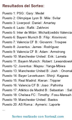 Lista de participantes: AC Milán Rafael Silva, AC Milán Yacine Brahimi, AC Milán Pedro Rodriguez Ledesma, AC Milán Ross Barkley, AC Milán Nani, AC Milán Sven Bender, AC Milán Donis Avdijaj, AC Milán Luis Muriel, AC Milán Christian Benteke, AC Milán Jan Vertonghen, AC Milán Bojan Krkic, AC Milán Stefan De Vrij, AC Milán Andrés Iniesta, AC Milán Ivan Perisic, AC Milán Fabinho, AC Milán Brice Dja Djedjé, AC Milán Gerónimo Rulli, AC Milán Tim Krul, AC Milán Nacho Monreal, AC Milán Cesar Azpilicueta, Arsenal Antonio Mirante, Arsenal Asmir Begovic, Arsenal Bruno Peres, Arsenal Rafael Varane, Arsenal Keita Baldé Diao, Arsenal Davinson Sánchez, Arsenal Andrea Barzagli, Arsenal Luke Shaw, Arsenal Frank Fabra, Arsenal Bruno Fernandes, Arsenal Manuel Fernandes, Arsenal Paulinho, Arsenal Eduardo Salvio, Arsenal Diogo Jota, Arsenal Marlos Romero Bonfim, Arsenal Domenico Berardi, Arsenal Ángel Correa, Arsenal Yevhen Konoplyanka, Arsenal Miguel Almirón, Arsenal Bertrand Traoré, Arsenal Kylian Mbappe Lottin, Arsenal Taison, Arsenal Christian Pulisic, Arsenal B Alban Lafont, Arsenal B Edmilson Junior, Arsenal B Bingourou Kamara, Arsenal B Guillerme Arana, Arsenal B Edson Alvarez, Arsenal B Richarlison, Arsenal B Antonio Barreca, Arsenal B Leo Bonatini, Arsenal B Dimitri Oberlin, Arsenal B Saidy Janko, Arsenal B Rafa Mir, Arsenal B Valentino Lázaro, Arsenal B John Murillo, Arsenal B Tammy Abraham, Arsenal B Steven Bergwijn, Arsenal B Godfred Donsah, Arsenal B Adam Ounas, Arsenal B Cristian Pavón, Arsenal B Pol Lirola, Arsenal B Riccardo Orsolini, Arsenal B Yeferson Soteldo, Arsenal B Maximiliano Romero, Arsenal B Derrick Luckassen, Arsenal B Zakaria Bakkali, Arsenal B Jordi Mboula, Atlético de Madrid Rubén Blanco, Atlético de Madrid Juan Bernat, Atlético de Madrid Dani Alves, Atlético de Madrid Laurent Koscielny, Atlético de Madrid Marcel Schmelzer, Atlético de Madrid Arda Turan, Atlético de Madrid Lucas Vazquez, Atlético de Madrid Iñaki Williams, Atlético de Madrid Matthijs de Ligt, Atlético de Madrid Giovanni Simeone, Atlético de Madrid Aissa Mandi, Atlético de Madrid Kyriakos Papadopoulos, Atlético de Madrid Mathieu Valbuena, Atlético de Madrid David Silva, Atlético de Madrid Thiago Alcántara, Atlético de Madrid Diego Costa, Atlético de Madrid Gerard Deulofeu, Atlético de Madrid Jesse Lingard, Atlético de Madrid Marco Reus, Atlético de Madrid Renato Sanches, Atlético de Madrid Lars Bender, Atlético de Madrid Lucas Hernández, Atlético de Madrid Thibaut Courtois, Atlético de Madrid B Unai Simon, Atlético de Madrid B Justin Hoogma, Atlético de Madrid B Adrian Marin, Atlético de Madrid B Tyronne Ebuehi, Atlético de Madrid B Yves Bissouma, Atlético de Madrid B Sebastian Salazar, Atlético de Madrid B Ronaldo Vieira, Atlético de Madrid B Jonathan Ikone, Atlético de Madrid B Ewandro Felipe de Lima, Atlético de Madrid B Joao Carvalho, Atlético de Madrid B Jeando Fuchs, Atlético de Madrid B Tosin Adarabioyo, Atlético de Madrid B Blas Riveros, Atlético de Madrid B Mo El Hankouri, Atlético de Madrid B Thierry Ambrose, Atlético de Madrid B André Moreira, Atlético de Madrid B Panagiotis Retsos, Atlético de Madrid B Mason Mount, Atlético de Madrid B Danilo (Braga), Atlético de Madrid B Marcelo Saracchi, Atlético de Madrid B Yann Karamoh, Atlético de Madrid B Bruno Xadas, Atlético de Madrid B Han Kwang Song, Atlético de Madrid B Alexis Blin, Bayer Leverkusen Marc Bartra, Bayer Leverkusen Jonas, Bayer Leverkusen Steve Mandanda, Bayer Leverkusen Shinji Kagawa, Bayer Leverkusen Manuel Lanzini, Bayer Leverkusen Omer Tropak, Bayer Leverkusen Marcelo (DFC), Bayer Leverkusen Darijo Srna, Bayer Leverkusen Ever Banega, Bayer Leverkusen Roberto (cedido por la UD) Firmino, Bayer Leverkusen Younes Belhanda, Bayer Leverkusen Samir Handanovic, Bayer Leverkusen Giuliano, Bayer Leverkusen Filipe Luis, Bayer Leverkusen Iago Aspas, Bayer Leverkusen Ciro Immobile, Bayer Leverkusen Marvell Wynne, Bayer Leverkusen Claudio Marchisio, Bayer Leverkusen Javier Pastore, Borussia Dortmund Mikel Oyarzabal, Borussia Dortmund Yuri Berchiche, Borussia Dortmund Gerard Pique, Borussia Dortmund André Silva, Borussia Dortmund Marco Asensio, Borussia Dortmund Marcos Alonso, Borussia Dortmund Aleix Vidal, Borussia Dortmund Diego López, Borussia Dortmund Gianluigi Donnarumma, Borussia Dortmund Joaozinho, Borussia Dortmund Gabriel Mercado, Borussia Dortmund Mahmoud Dahoud, Borussia Dortmund Mikel Merino, Borussia Dortmund Hakan Calhanoglu, Borussia Dortmund Miralem Pjanic, Borussia Dortmund Daniel Wass, Borussia Dortmund Danny Welbeck, Borussia Dortmund Kingsley Coman, Borussia Dortmund Sergio Ramos, Borussia Dortmund Angel Di Maria, Juventus Neven Subotic, Juventus Emilio Nsue, Juventus Andre Schürrle, Juventus Rui Patricio, Juventus Fernando Llorente, Juventus Ron-Robert Zieler, Juventus Diogo Figueiras, Juventus Patrick Van Aanholt, Juventus Stephan Lichtsteiner, Juventus Wayne(cedido Liverpool) Rooney, Juventus Enis Bardhi, Juventus Andres Guardado, Juventus Daniele De Rossi, Juventus Jefferson Farfán, Juventus Mapou Yanga-Mbiwa, Juventus Kévin Gameiro, Juventus Florentin Pogba, Juventus Victor Ibarbo, Juventus Clinton N'Jie, Juventus James Rodríguez, Toronto FC Paul Pogba, Toronto FC Jonas Hector, Toronto FC Manolo Gabbiadini, Toronto FC Vincent Aboubakar, Toronto FC Salvatore Sirigu, Toronto FC David Villa, Toronto FC Juan Jesús, Toronto FC Marco Benassi, Toronto FC Antonio Rüdiger, Toronto FC Alejandro Gómez, Toronto FC Riyad Mahrez, Toronto FC Orestis Karnezis, Toronto FC Pablo Fornals, Toronto FC Ricardo Quaresma, Toronto FC Federico Bernardeschi, Toronto FC Angelo Ogbonna, Toronto FC Joao Cancelo, Toronto FC Yannick Ferreira Carrasco, Toronto FC Jason Denayer, Toronto FC Benjamin Mendy, FC Barcelona Lars Stindl, FC Barcelona Nicolas Gaitan, FC Barcelona Adnan Januzaj, FC Barcelona Michell Weiser, FC Barcelona Cristian Eriksen, FC Barcelona Stephane Ruffier,