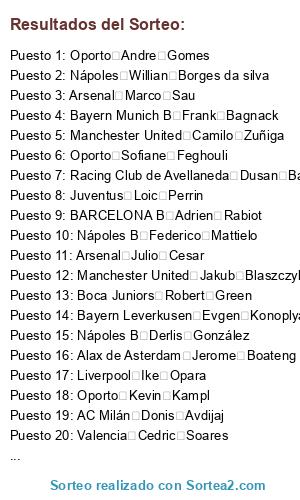 Lista de participantes: AC Milán Rafael Silva, AC Milán Jeremy Mathieu, AC Milán Pedro Rodriguez Ledesma, AC Milán Mauro Zarate, AC Milán Younés Kaboul, AC Milán Nani, AC Milán Soldado, AC Milán Sven Bender, AC Milán Donis Avdijaj, AC Milán Andrés Guardado, AC Milán Christian Benteke, AC Milán Jan Vertonghen, AC Milán Stefan De Vrij, AC Milán Kevin Volland, AC Milán Bojan Krkic, AC Milán Kevin Mirallas, AC Milán Fabinho, AC Milán Asmir Begovic, AC Milán Tim Krul, AC Milán Ashley Cole, AC Milán Nacho Monreal, AC Milán Cesar Azpilicueta, AC Milán Ivan Perisic, ACF FIORENTINA Dani Parejo, ACF FIORENTINA Julio Buffarini, ACF FIORENTINA Maxime Gonalons, ACF FIORENTINA Thiago Motta, ACF FIORENTINA Anthony Martial, ACF FIORENTINA Jesus Gamez, ACF FIORENTINA Juan Bernat, ACF FIORENTINA Cristian Zapata, ACF FIORENTINA Zakaria Bakkali, ACF FIORENTINA Roberto Firmino, ACF FIORENTINA José Callejón, ACF FIORENTINA Aymeric Laporte, ACF FIORENTINA Franck Ribery, ACF FIORENTINA Burak Yilmaz, ACF FIORENTINA Claudio Bravo, ACF FIORENTINA Mario Mandzukic, ACF FIORENTINA Kevin Strootman, ACF FIORENTINA Roman Burki, ACF FIORENTINA Bernardo Espinosa, ACF FIORENTINA Timo Horn, ACF FIORENTINA Javier Mascherano, ACF FIORENTINA Heung-Min Son, ACF FIORENTINA Naldo, ACF FIORENTINA Alexandre Lacazette, ACF FIORENTINA Gerard Deulofeu, ACF FIORENTINA B Denizhan Deniz, ACF FIORENTINA B Yossuf Poulsen, ACF FIORENTINA B Antonio Sanabria, ACF FIORENTINA B Godfred Donsah, ACF FIORENTINA B Frederik Sorensen, ACF FIORENTINA B Jonathan Tah, ACF FIORENTINA B Borja Lopez, ACF FIORENTINA B Fraser Kerr, ACF FIORENTINA B Jorge Mere Perez, ACF FIORENTINA B Pedro Obiang, ACF FIORENTINA B Diego Jota, ACF FIORENTINA B Felix Passlack, ACF FIORENTINA B Adam Armstrong, ACF FIORENTINA B Juan Muñiz, ACF FIORENTINA B Rey Manaj, ACF FIORENTINA B Lass Bangoura, ACF FIORENTINA B Gabriel Castellon, ACF FIORENTINA B Adam Maher(cedido Fiore B del Oporto B,Temp XIII), ACF FIORENTINA B Gabriel Fernando de Jesus(Cedido Fiore B del Oporto B,Temp XIII), ACF FIORENTINA B Stefanos Kapino(Cedido Fiore B del Oporto B,Temp XIII), ACF FIORENTINA B Victor Andrade(cedido Fiore B del Oporto B ,Temp XIII), ACF FIORENTINA B Leandrinho, ACF FIORENTINA B Alex Serrano, ACF FIORENTINA B Pablo Perez, ACF FIORENTINA B Carlos Castro, Alax de Asterdam Paul Pogba, Alax de Asterdam Philippe Mexes, Alax de Asterdam Tino Costa, Alax de Asterdam Memphis Depay, Alax de Asterdam Joe Hart, Alax de Asterdam Jeremy Toulalan, Alax de Asterdam Jerome Boateng, Alax de Asterdam Diogo Figueiras, Alax de Asterdam Maxime Lestienne, Alax de Asterdam Daniele Verde, Alax de Asterdam Kingsley Coman, Alax de Asterdam Manolo Gabbiadini, Alax de Asterdam Patrice Evra, Alax de Asterdam Simone Zaza, Alax de Asterdam Jeremy Menez, Alax de Asterdam Diego Benaglio, Alax de Asterdam Sergio Ramos, Alax de Asterdam Seamus Coleman, Alax de Asterdam Zatlan Ibrahimovic, Alax de Asterdam Douglas Costa, Alax de Asterdam Raul Meireles, Arsenal Andrea Barzagli, Arsenal Mauricio Isla, Arsenal Frank Fabra, Arsenal Karim Bellarabi, Arsenal Victor Obinna, Arsenal Cheikhou Kouyate, Arsenal Daniele Baselli, Arsenal Paul-Georges Ntep, Arsenal Stefan Radu, Arsenal Yacine Brahimi, Arsenal Maicon, Arsenal Jefferson Farfán, Arsenal Marlos Romero Bonfim, Arsenal Marco Sau, Arsenal Tongo Doumbia, Arsenal Alexandre Pato, Arsenal Julio Cesar, Arsenal Bruno Peres, Arsenal Manuel Fernandes, Arsenal Nordin Amrabat, Arsenal Alisson Ramses Becker, Arsenal Federico Mancuello, Arsenal Darlington Nagbe, Arsenal Jetro Willems, ATLÉTICO MADRID Wellington Silva, ATLÉTICO MADRID Vicente Guaita, ATLÉTICO MADRID Derick Tshimanga, ATLÉTICO MADRID Laurent Koscielny, ATLÉTICO MADRID Gonzalo Higuain, ATLÉTICO MADRID Raheem Sterling, ATLÉTICO MADRID Yannick Ferreira carrasco, ATLÉTICO MADRID Jesus Corona, ATLÉTICO MADRID Gervinho Yao, ATLÉTICO MADRID Moussa Marega, ATLÉTICO MADRID Marcel Schmelzer, ATLÉTICO MADRID Philippe Coutinho, ATLÉTICO MADRID Moussa Sissoko, ATLÉTICO MADRID Javi Martinez, ATLÉTICO MADRID Georginio Wijnaldum, ATLÉTICO MADRID Jorginho, ATLÉTICO MADRID James Milner, ATLÉTICO MADRID Michel Macedo, ATLÉTICO MADRID Mohammed Al Sahlawi, ATLÉTICO MADRID Mateo Musacchio, ATLÉTICO MADRID Thibaut Courtois, ATLÉTICO MADRID Thomas Muller, ATLÉTICO MADRID Xabi Alonso, BARCELONA Lars Stindl, BARCELONA Sergio Busquets, BARCELONA Nicolas Gaitan, BARCELONA Yohan Cabaye, BARCELONA Nathaniel Clyne, BARCELONA Benjamin Moukandjo, BARCELONA Konstantinos Manolas, BARCELONA Cristian Ansaldi, BARCELONA Aymen Abdennour, BARCELONA Cristian Eriksen, BARCELONA Stephane Ruffier, BARCELONA Carlos Darwin Quintero, BARCELONA Carlos Vela, BARCELONA Luis Suarez, BARCELONA Jese Rodriguez, BARCELONA Adem Ljajic, BARCELONA Gary Cahill, BARCELONA Granit Xhaka, BARCELONA Fabian Orellana, BARCELONA Simon Mignolet, BARCELONA Nicolas N'koulou, BARCELONA B Stefano Denswil, BARCELONA B Thorgan Hazard, BARCELONA B Mitchell Weiser, BARCELONA B Diego Reyes, BARCELONA B Isaac Success, BARCELONA B Horrit Hendrix, BARCELONA B Youri Tielemans, BARCELONA B Joshua Kimmich, BARCELONA B Julian Weigl, BARCELONA B Ahmed Hassan, BARCELONA B Jesse Lingard, BARCELONA B Josef Martinez, BARCELONA B Chuba Akpom, BARCELONA B Adnan Januzaj, BARCELONA B Marcos Lopes, BARCELONA B Mory Kone, BARCELONA B Seko Fofana, BARCELONA B Nathan Redmond, BARCELONA B Angel Correa, BARCELONA B Adrien Rabiot, BARCELONA B Calum Chambers, BARCELONA B Pione Sisto, BARCELONA B Nicola Leali, BARCELONA B Raphael Guerreiro, Bayern Leverkusen Stevan Jovetic(cedido al Leverkusen del Nápoles,Temp XIII), Bayern Leverkusen Jose Vazquez, Bayern Leverkusen Jonas, Bayern Leverkusen Steve Mandanda, Bayern Leverkusen Shinji Kagawa, Bayern Leverkusen Andoni Iraola, Bayern Leverkusen Giuseppe Rossi, Bayern Leverkusen Jerry Akaminko, Bayern Leverkusen Patrick Herrmann, Bayern Leverkusen Evgen Konoplyanka(Cedido Leverkusen de la UDLP,Temp XIII), Bayern Leverkusen Rasmus