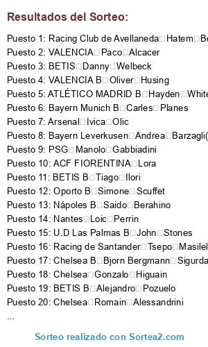 Lista de participantes: AC Milán Nacho Monreal, AC Milán Jeremy Mathieu, AC Milán Antonio Candreva, AC Milán Camilo Zuñiga, AC Milán Sven Bender, AC Milán Kevin Mirallas, AC Milán Kevin Volland, AC Milán Tim Krul, AC Milán Oussama Assaidi, AC Milán Aaron Lennon, AC Milán Mauro Zarate, AC Milán Younés Kaboul, AC Milán Fabricio Coloccini, AC Milán Obafemi Martins, AC Milán Jefferson Farfan, AC Milán Jan Vertonghen, AC Milán Andrés Guardado, AC Milán Ashley Cole, AC Milán Soldado, AC Milán Asmir Begovic, ACF FIORENTINA Dani Parejo, ACF FIORENTINA Mario Mandzukic, ACF FIORENTINA Thiago Motta, ACF FIORENTINA Maximiliano Moralez, ACF FIORENTINA Kevin Strootman, ACF FIORENTINA Lora, ACF FIORENTINA Aritz Aduriz, ACF FIORENTINA Aymeric Laporte, ACF FIORENTINA Keylor Navas, ACF FIORENTINA Danilo, ACF FIORENTINA Roman Burki, ACF FIORENTINA Luiz Gustavo, ACF FIORENTINA Xherdan Shaqiri, ACF FIORENTINA Roberto Firmino, ACF FIORENTINA José Callejón, ACF FIORENTINA Naldo, ACF FIORENTINA Eden Hazard, ACF FIORENTINA Gokhan Gonul, ACF FIORENTINA Daniel Agger, ACF FIORENTINA Mapou Yanga-Mbiwa, ACF FIORENTINA Cristian Zapata, ACF FIORENTINA Claudio Bravo, ACF FIORENTINA Dzeko, ACF FIORENTINA B Pedro Obiang, ACF FIORENTINA B Borja Lopez, ACF FIORENTINA B Timo Horn, ACF FIORENTINA B Juan Muñiz, ACF FIORENTINA B Fraser Kerr, ACF FIORENTINA B Alex Serrano, ACF FIORENTINA B Pablo Perez, ACF FIORENTINA B Gabriel Castellon, ACF FIORENTINA B Jonathan Tah, ACF FIORENTINA B Godfred Donsah, ACF FIORENTINA B Dani Ndi, ACF FIORENTINA B Frederik Sorensen, ACF FIORENTINA B Anthony Martial, ACF FIORENTINA B Carlos Castro, ACF FIORENTINA B Christian Clemens, ACF FIORENTINA B Yossuf Poulsen, ACF FIORENTINA B Shawn Parker, ACF FIORENTINA B Lass Bangoura, Arsenal Berbatov, Arsenal Carlos Zambrano, Arsenal Philippe Coutinho, Arsenal Carlos Mane, Arsenal Ciro Immobile, Arsenal Norberto Neto, Arsenal Serge Gakpe, Arsenal Pepe, Arsenal Antonio Valencia, Arsenal Carlos Tevez, Arsenal Juan Arango, Arsenal Andre Ayew, Arsenal Stephan Lichtsteiner, Arsenal Mubarak Wakaso, Arsenal Roman Weidenfeller, Arsenal Alex Telles, Arsenal Carlos Peña, Arsenal Hugo Campagnaro, Arsenal Darijo Srna, Arsenal Philippe Mexes, Arsenal Ivica Olic, Arsenal Alex Rodrigo Diaz da Costa, Arsenal Jermaine Jones, Arsenal Ever Banega, Arsenal Cristian Zaccardo, ATLÉTICO MADRID Ander Iturraspe, ATLÉTICO MADRID Kolo Toure, ATLÉTICO MADRID Jonathan Dos Santos, ATLÉTICO MADRID Emilio Nsue, ATLÉTICO MADRID Fernando Torres, ATLÉTICO MADRID Arda Turan, ATLÉTICO MADRID Ander Herrera, ATLÉTICO MADRID Steven Caulker, ATLÉTICO MADRID Ivan Rakitic, ATLÉTICO MADRID Oliver Giroud, ATLÉTICO MADRID Dries Mertens, ATLÉTICO MADRID Laurent Koscielny, ATLÉTICO MADRID Jonathan Biabiany, ATLÉTICO MADRID Veli Kavkak, ATLÉTICO MADRID Artur Moraes, ATLÉTICO MADRID Konstantine Rausch, ATLÉTICO MADRID Raheem Sterling, ATLÉTICO MADRID Pedro Rodriguez, ATLÉTICO MADRID Andres Iniesta, ATLÉTICO MADRID Derick Tshimanga, ATLÉTICO MADRID Klaas-Jan Huntelaar, ATLÉTICO MADRID Thibaut Courtois, ATLÉTICO MADRID Jose Manuel Fernandez, ATLÉTICO MADRID B Mickey Van Der Hart, ATLÉTICO MADRID B Momar N'Doye, ATLÉTICO MADRID B Pablo Sarabia, ATLÉTICO MADRID B Terence Kongolo, ATLÉTICO MADRID B Marco D'Alessandro, ATLÉTICO MADRID B Mamadou Tounkara, ATLÉTICO MADRID B Ibrahima Conte, ATLÉTICO MADRID B Hayden White, BARCELONA Nathaniel Clyne, BARCELONA Gaston Ramirez, BARCELONA Paul Pogba, BARCELONA Marco Verratti, BARCELONA Stefan Radu, BARCELONA Carlos Darwin Quintero, BARCELONA Stephane Ruffier, BARCELONA Simon Mignolet, BARCELONA Cristian Eriksen, BARCELONA Thorgan Hazard, BARCELONA Nicolas Gaitan, BARCELONA Nicolas N'koulou, BARCELONA Cristian Ansaldi, BARCELONA Taison Barcellos Freda, BARCELONA Jesus Gamez, BARCELONA Adan Lallana, BARCELONA Rio Mavuba, BARCELONA Oscar dos Santos, BARCELONA Artem Dzyuba, BARCELONA Carlos Bacca, BARCELONA Aymen Abdennour, BARCELONA Yohan Cabaye, BARCELONA Gary Cahill, BARCELONA B Seko Fofana, BARCELONA B Stefano Denswil, BARCELONA B Joshua Kimmich, BARCELONA B Diego Reyes, BARCELONA B Youri Tielemans, BARCELONA B Marcos Lopes, BARCELONA B Raphael Guerreiro, BARCELONA B Jordan Lukaku, BARCELONA B Chuba Akpom, BARCELONA B Adnan Januzaj, BARCELONA B Jesse Lingard, BARCELONA B Nicola Leali, BARCELONA B Victor Wanyama, BARCELONA B Mitchell Weiser, BARCELONA B Mory Kone, BARCELONA B Luis Gil, BARCELONA B Josef Martinez, BARCELONA B Adrien Rabiot, BARCELONA B Nathan Redmond, BARCELONA B Calum Chambers, BARCELONA B Horrit Hendrix, BARCELONA B Fabio Borini, BARCELONA B Granit Xhaka, BARCELONA B Luca Caldirola, Bayern Leverkusen Tiago Cardoso Mendes, Bayern Leverkusen Shinji Kagawa, Bayern Leverkusen Ruben Garcia, Bayern Leverkusen Zacaria Labyad, Bayern Leverkusen Felipe Melo, Bayern Leverkusen Fabio Coentrao, Bayern Leverkusen Andre Carrillo, Bayern Leverkusen Joao Moutinho, Bayern Leverkusen Tolga Zengin, Bayern Leverkusen Giuseppe Rossi(cedido al Leverkusen Temp X), Bayern Leverkusen Glen Johnson, Bayern Leverkusen Mohamed Salah, Bayern Leverkusen Mathieu Valbuena, Bayern Leverkusen Stevan Jovetic, Bayern Leverkusen Radja Nainggolan, Bayern Leverkusen Emmanuel Emenike, Bayern Leverkusen Andrea Barzagli(cedido al Leverkusen Temp X), Bayern Leverkusen Victor Valdes, Bayern Leverkusen Aurelien Chedjou, Bayern Leverkusen Jakub Blaszczykowski, Bayern Munich Keita Balde diao, Bayern Munich Jordi Alba, Bayern Munich Ola John, Bayern Munich Samuel Etoo, Bayern Munich Gerard Pique, Bayern Munich Mario Gotze, Bayern Munich Asier Illarramendi, Bayern Munich Vicente Guaita, Bayern Munich Pablo Zabaleta, Bayern Munich Daniel Sturridge, Bayern Munich Alberto Moreno, Bayern Munich Stefan Savic, Bayern Munich Gerard Deulofeu, Bayern Munich Joel Matip, Bayern Munich Javier Mascherano, Bayern Munich Lucas Moura Da Silva, Bayern Munich Robin van Persie(cedido al Bayern Temp X), Bayern Munich Koke, Bayern Munich Willian Borges da silva, Ba