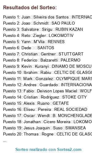 Lista de participantes: Kolbeinn Sigthorsson AJAX, Zacaria Labyad AJAX, Jordy Clasie AJAX, Siem De Jong AJAX, Toby Alderweireld AJAX, Marcos Rojo AJAX, Cristian Eriksen AJAX, Ryan Babel AJAX, Daley Blind AJAX, Luis Pedro Cavanda AJAX, Miralem Sulejmani AJAX, Ricardo Van Rhijn AJAX, Marco Van Ginkel AJAX, Kenneth Vermeer AJAX, Jasper Cillessen AJAX, Eyong Enoh AJAX, Lasse Schone AJAX, Thulani Serero AJAX, Tobias Sana AJAX, Niklas Moisander AJAX, Christian Poulsen AJAX, Ryan Bertrand AJAX, Mario Mandzukic AJAX, Bruno Martins Indi AJAX, Moritz Leitner ANDERLECHT, Wellington Nem ANDERLECHT, Cristian Tello ANDERLECHT, Didier Drogba ANDERLECHT, Serigne Kara ANDERLECHT, M'Baye Niang ANDERLECHT, Matias Suarez ANDERLECHT, Cheikhou Kouyate ANDERLECHT, Silvio Proto ANDERLECHT, Bram Nuytinck ANDERLECHT, Behrang Safari ANDERLECHT, Denis Odoi ANDERLECHT, Guillaume Gillet ANDERLECHT, Oleksandr Yakovenko ANDERLECHT, Roland Vargas ANDERLECHT, Kanu dos Santos da Rocha ANDERLECHT, Guillermo Molins ANDERLECHT, Milan Jovanovic ANDERLECHT, Cyriac Gohi Bi ANDERLECHT, Dieumerci Mbokani ANDERLECHT, Oliver Torres ANDERLECHT, Alex Grimaldo ANDERLECHT, Jack Butland ANDERLECHT, Denis Suarez ANDERLECHT, Michael Rensing ANDERLECHT, Adryan Oliveira Tavares ANDERLECHT, Jano Ananidze ANZHI, Georgi Schennikov ANZHI, Mbark Boussoufa ANZHI, Christopher Samba ANZHI, Samuel Eto'o ANZHI, Lass Diarra ANZHI, Nicolas Nkoulou ANZHI, Kamil Agalarov ANZHI, Odil Akhmedov ANZHI, Mehdi Carcela-Gonzalez ANZHI, Ewerton ANZHI, Vladimir Gabulov ANZHI, Ali Gadzhibekov ANZHI, Jucilei ANZHI, Arseni Logashov ANZHI, Sharif Mukhammad ANZHI, Evgeni Pomazan ANZHI, Oleg Shatov ANZHI, Yuri Zhirkov ANZHI, Nikita Burmistrov ANZHI, Cristian Pasquato ANZHI, Serge Aurier ANZHI, Nnamdi Oduamadi ANZHI, Ciaran Clark ASTON VILLA, Fabian Delph ASTON VILLA, Aiden McGeady ASTON VILLA, Fabrizio Miccoli ASTON VILLA, Loic Remy ASTON VILLA, Darren Bent ASTON VILLA, Marc Albrighton ASTON VILLA, Felipe Santana ASTON VILLA, Idriss Carlos Kameni ASTON VILLA, Roland Lamah ASTON VILLA, Abdoulay Konko ASTON VILLA, Brad Guzan ASTON VILLA, Eric Lichaj ASTON VILLA, Karim El Ahmadi ASTON VILLA, Barry Bannan ASTON VILLA, Christian Benteke ASTON VILLA, Huga Ayala ASTON VILLA, Anthony Annan ASTON VILLA, Davy Claude Angan ASTON VILLA, Maximiliano Moralez ASTON VILLA, Avraam Papadopoulos ASTON VILLA, Carles Puyol ATH. BILBAO, Sergio Canales ATH. BILBAO, Jose Maria Callejon ATH. BILBAO, Gorka Iraizoz ATH. BILBAO, Andoni Iraola ATH. BILBAO, Mikel San Jose ATH. BILBAO, Fernando Amorebieta ATH. BILBAO, Markel Susaeta ATH. BILBAO, Iker Muniain ATH. BILBAO, Aritz Aduriz ATH. BILBAO, Fernando Llorente ATH. BILBAO, Ander Herrera ATH. BILBAO, Borja Ekiza ATH. BILBAO, Nacho Monreal ATH. BILBAO, Ander Iturraspe ATH. BILBAO, Oscar De Marcos ATH. BILBAO, Iñigo Perez ATH. BILBAO, Raul Fernandez ATH. BILBAO, Xabier Castillo ATH. BILBAO, Carlos Gurpegi ATH. BILBAO, Ibai Gomez ATH. BILBAO, Mario Suarez ATH. BILBAO, Kelvin Mateus de Oliveira B. MONCHENGLADBACH, Steven Caulker B. MONCHENGLADBACH, Leroy Fer B. MONCHENGLADBACH, Havard Nordtveit B. MONCHENGLADBACH, Bernd Leno B. MONCHENGLADBACH, Peniel Mlapa B. MONCHENGLADBACH, Granit Xhaka B. MONCHENGLADBACH, Oscar Wendt B. MONCHENGLADBACH, Patrick Herrmann B. MONCHENGLADBACH, Alvaro Dominguez B. MONCHENGLADBACH, Isco Alarcon B. MONCHENGLADBACH, Luuk De Jong B. MONCHENGLADBACH, Kerim Frei B. MONCHENGLADBACH, Aleksandar Dragovic B. MONCHENGLADBACH, Janis Blaswich B. MONCHENGLADBACH, Martin Stranzi B. MONCHENGLADBACH, Tony Jantschke B. MONCHENGLADBACH, Tolga Cigerci B. MONCHENGLADBACH, Alexander Ring B. MONCHENGLADBACH, Juan Arango B. MONCHENGLADBACH, Lukas Rupp B. MONCHENGLADBACH, Igor de Camargo B. MONCHENGLADBACH, Alexander Esswein B. MONCHENGLADBACH, Lorenzo Melgarejo B. MONCHENGLADBACH, Alvaro Vadillo BETIS, Alejandro Pozuelo BETIS, Erik Lamela BETIS, Didac Vila BETIS, Miralem Pjanic BETIS, Angel Lopez BETIS, Salvador Agra BETIS, Casto Espinosa Barriga BETIS, Adrian San Miguel del Castillo BETIS, Fabricio Agosto Ramirez BETIS, Mario Alvarez BETIS, Antonio Amaya BETIS, Jose Antonio Dorado BETIS, Paulao Alfonso Santos Junior BETIS, Alex Martinez BETIS, Nacho Perez BETIS, Nelson Augusto Tomar Ramos BETIS, Ruben Perez BETIS, Jose Alberto Cañas BETIS, Juan Carlos Perez BETIS, Ruben Castro BETIS, Jonathan Pereira BETIS, Jorge Molina BETIS, Damien Perquis BETIS, Nosa Igiebor BETIS, Eneko Eizmendi BETIS, Diego Lopez CELTA DE VIGO, Ivan Rakitic CELTA DE VIGO, Sergio Alvarez CELTA DE VIGO, Javi Varas CELTA DE VIGO, Andres Tuñez CELTA DE VIGO, Gustavo Cabral CELTA DE VIGO, Samuel Llorca CELTA DE VIGO, Roberto Lago CELTA DE VIGO, Carlos Bellvis CELTA DE VIGO, Borja Oubiña CELTA DE VIGO, Cristian Bustos CELTA DE VIGO, Alex Lopez CELTA DE VIGO, Augusto Fernandez CELTA DE VIGO, Natxo Insa CELTA DE VIGO, Michael Krohn-Dehli CELTA DE VIGO, Mario Bermejo CELTA DE VIGO, Iago Aspas CELTA DE VIGO, Chu-Young Park CELTA DE VIGO, Cicinho Sandro Mendonça dos Santos CELTA DE VIGO, Gary Hooper CELTIC DE GLASGOW, Ryan Giggs CELTIC DE GLASGOW, Francesco Totti CELTIC DE GLASGOW, Biram Kayal CELTIC DE GLASGOW, Miku Fedor Flores CELTIC DE GLASGOW, Jose Manuel Jurado CELTIC DE GLASGOW, Steven Taylor CELTIC DE GLASGOW, Adam Matthews CELTIC DE GLASGOW, James Forrest CELTIC DE GLASGOW, Ibrahim Rabiu CELTIC DE GLASGOW, Fraser Foster CELTIC DE GLASGOW, Lukasz Zaluska CELTIC DE GLASGOW, Kelvin Wilson CELTIC DE GLASGOW, Thomas Rogne CELTIC DE GLASGOW, Emilio Izaguirre CELTIC DE GLASGOW, Charlie Mulgrew CELTIC DE GLASGOW, Mikael Lustig CELTIC DE GLASGOW, Victor Wanyama CELTIC DE GLASGOW, Scott Brown CELTIC DE GLASGOW, Joe Ledley CELTIC DE GLASGOW, Kris Commons CELTIC DE GLASGOW, Paddy McCourt CELTIC DE GLASGOW, Georgios Samaras CELTIC DE GLASGOW, Anthony Stokes CELTIC DE GLASGOW, Jesus Gamez CELTIC DE GLASGOW, Efe Ambrose CELTIC DE GLASGOW, Lassad Nouioui CELTIC DE GLASGOW, Jose Paulo Paulinho CORINTHIANS, Julio Cesar de Souza Santos CORINTHIANS, Cassio Ramos CORINTHIANS, Chicao Seba