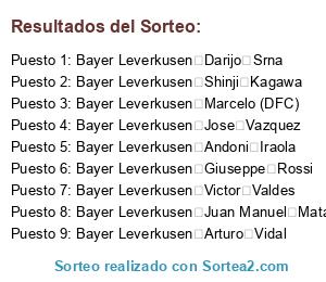 Lista de participantes: Bayer Leverkusen Jose Vazquez, Bayer Leverkusen Jonas, Bayer Leverkusen Steve Mandanda, Bayer Leverkusen Shinji Kagawa, Bayer Leverkusen Andoni Iraola, Bayer Leverkusen Giuseppe Rossi, Bayer Leverkusen Marcelo (DFC), Bayer Leverkusen Darijo Srna, Bayer Leverkusen Arturo Vidal, Bayer Leverkusen Victor Valdes, Bayer Leverkusen Thiago Alcantara, Bayer Leverkusen Marvell Wynne, Bayer Leverkusen Juan Manuel Mata, Bayer Leverkusen Frank Ribery.
