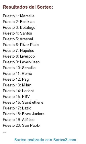 Lista de participantes: Botafogo, Barcelona, Borussia, River Plate, Boca Juniors, Leverkusen, Santos, Sao Paolo, Liverpool, Lazio, Schalke, Psg, Napoles, Saint ettiene, Arsenal, Lorient, Marsella, Milán, Besiktas, Atlético, Roma, PSV.