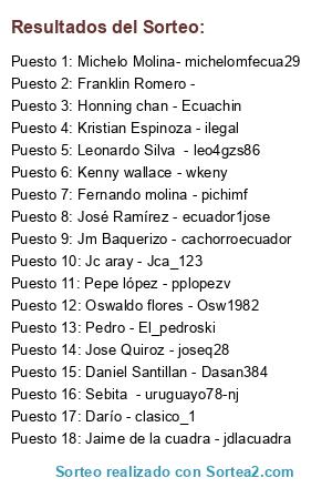 Lista de participantes: Kristian Espinoza - ilegal, Jc aray - Jca_123, Jose Quiroz - joseq28, Pedro - El_pedroski, Daniel Santillan - Dasan384, Oswaldo flores - Osw1982, Michelo Molina- michelomfecua29, Sebita - uruguayo78-nj, Pepe lópez - pplopezv, José Ramírez - ecuador1jose, Jaime de la cuadra - jdlacuadra, Jm Baquerizo - cachorroecuador, Honning chan - Ecuachin, Leonardo Silva - leo4gzs86, Darío - clasico_1, Kenny wallace - wkeny, Fernando molina - pichimf, Franklin Romero -.