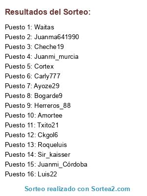 Lista de participantes: Txito21, Ckgol6, Juanma641990, Amortee, Herreros_88, Bogarde9, Carly777, Juanmi_Córdoba, Luis22, Cortex, Waitas, Ayoze29, Cheche19, Roqueluis, Sir_kaisser, Juanmi_murcia.