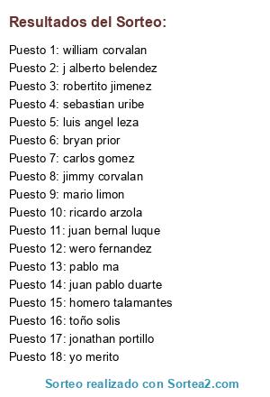 Lista de participantes: jonathan portillo, carlos gomez, wero fernandez, william corvalan, robertito jimenez, juan bernal luque, homero talamantes, mario limon, juan pablo duarte, pablo ma, toño solis, j alberto belendez, ricardo arzola, yo merito, jimmy corvalan, sebastian uribe, bryan prior, luis angel leza.