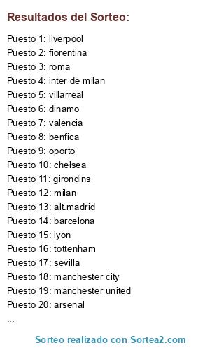 Lista de participantes: barcelona , real madrid, inter de milan , chelsea , manchester united , milan , juventus , arsenal , liverpool , roma , manchester city , tottenham , alt.madrid , valencia , aston villa , sevilla , fiorentina , oporto , ajax , dinamo , lyon , benfica , girondins , villarreal.