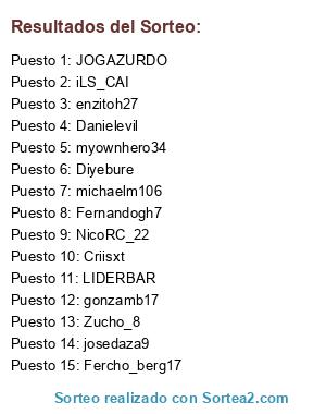 Lista de participantes: enzitoh27, Fernandogh7, myownhero34, Fercho_berg17, iLS_CAI, josedaza9, JOGAZURDO, gonzamb17, Zucho_8, LIDERBAR, NicoRC_22, michaelm106, Diyebure, Criisxt, Danielevil.