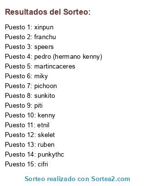 Lista de participantes: pichoon, franchu, ruben, kenny, pedro (hermano kenny), cifri, xinpun, skelet, martincaceres, speers, punkythc, sunkito, etnil, piti, miky.