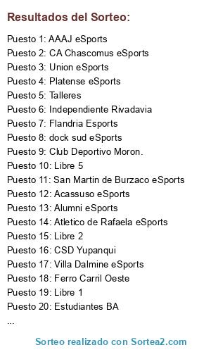 Lista de participantes: AAAJ eSports, Acassuso eSports, All Boys eSports, Almagro eSports, Alumni eSports, Argentino de Rosario eSports, Arsenal eSports, Atlanta eSport, Atletico de Rafaela eSports, Banfield eSports, CA Brown eSports, CA Chascomus eSports, CA Claypole eSports, CA Huracan Esports, CA Independiente, CA Tigre eSports, Cambaceres, Central eSports, Chacarita jrs esports, Club Atletico San Miguel, Club Deportivo Moron., Colon Esports, Comunicaciones eSports., CSD Yupanqui, Defensa y Justicia, Deportivo Merlo eSports, Deportivo Riestra, dock sud eSports, Douglas eSport, Estudiantes BA, Estudiantes rio4 esports, Excursionistas eSports, Ferro Carril Oeste, Flandria Esports, Gimnasia La Plata, Godoy Cruz eSports, Gral. Lamadrid eSports, Guillermo Brown eSports, Huracan CR esports, Independiente Rivadavia, Ituzaingo eSports, Juventud Antoniana eS, Midland eSports, Newells Old Boys., Nueva Chicago eSports, Platense eSports, Quilmes A.C, Sacachispas FC, San Martin de Burzaco eSports, San Telmo eSports, Sarmiento, Talleres, Temperley eSports, Union eSports, Villa Dalmine eSports, Villa San Carlos eSports, Libre 1, Libre 2, Libre 3, Libre 4, Libre 5, Libre 6, Libre 7, Libre 8.