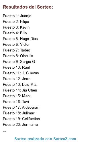 Lista de participantes: Kevin, Aldebaran, Billy, Tadeo, Mark, Julimar, J. Cuevas, Zizu, Jia Chen, Raul, Jermaine, Luis Mtz., Obdulio, Jean, Filipo, Hugo Dias, Cellfaction, Victor, Juanjo, Siglaz, Tavi, Eduardo L., Sergio G., Zeendy .