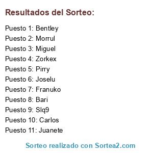 Lista de participantes: Slq9, Bari, Morrul, Carlos, Juanete, Joselu, Franuko, Pirry, Miguel, Zorkex, Bentley.