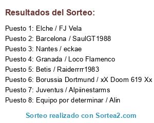 Nantes / eckae Barcelona / SaulGT1988 Elche / FJ Vela Juventus / Alpiinestarms Betis / Raiderrrr1983 Granada / Loco Flamenco Borussia Dortmund / xX Doom 619 Xx Equipo por determinar / Alin