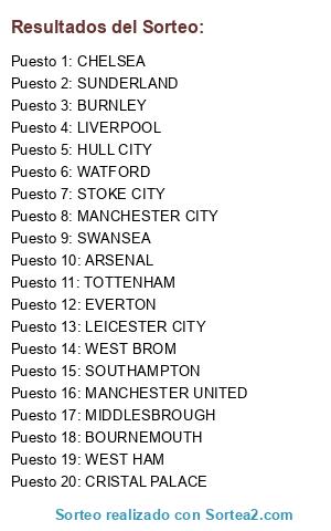 Lista de participantes: ARSENAL, CHELSEA, EVERTON, LIVERPOOL, MANCHESTER CITY, MANCHESTER UNITED, MIDDLESBROUGH, SOUTHAMPTON, TOTTENHAM, WEST HAM, LEICESTER CITY, SUNDERLAND, WEST BROM, WATFORD, BURNLEY, CRISTAL PALACE, STOKE CITY, BOURNEMOUTH, SWANSEA, HULL CITY.