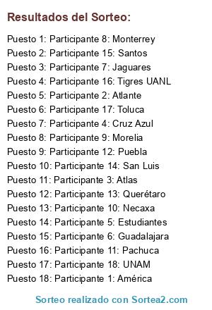 Lista de participantes: Participante 1: América, Participante 2: Atlante, Participante 3: Atlas, Participante 4: Cruz Azul, Participante 5: Estudiantes, Participante 6: Guadalajara, Participante 7: Jaguares, Participante 8: Monterrey, Participante 9: Morelia, Participante 10: Necaxa, Participante 11: Pachuca, Participante 12: Puebla, Participante 13: Querétaro, Participante 14: San Luis, Participante 15: Santos, Participante 16: Tigres UANL, Participante 17: Toluca, Participante 18: UNAM.