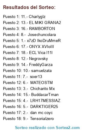 Lista de participantes: 1.- x7zD IkoDruMmeR, 2.- dan mc coyc, 3.- Chicharito Mx, 4.- LRH17MESSIAZ, 5.- DARKTIGER25, 6.- MATEOSTM, 7.- soer13, 8.- Josechuncolara, 9.- Tensorialzero, 10.- samuelzata, 11.- Charlyglz, 12.- Negrovsky, 13.- EL MIKI GRANA2, 14.- FreddyGarza, 15.- BuddacarTman, 16.- RAMBORTON, 17.- ONYX XVIoIII, 18.- ECL Vica l11l.