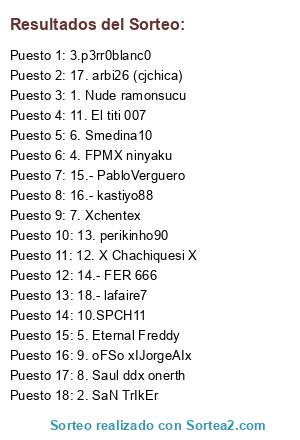 Lista de participantes: 1. Nude ramonsucu, 2. SaN TrIkEr, 3.p3rr0blanc0, 4. FPMX ninyaku, 5. Eternal Freddy, 6. Smedina10, 7. Xchentex, 8. Saul ddx onerth, 9. oFSo xIJorgeAIx, 10.SPCH11, 11. El titi 007, 12. X Chachiquesi X, 13. perikinho90, 14.- FER 666, 15.- PabloVerguero, 16.- kastiyo88, 17. arbi26 (cjchica), 18.- lafaire7.