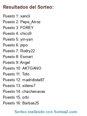 Lista de participantes: AKTGANO, Barbas25, pipo, FOREY, chico9, xancli, madridista87, Angel, yin-yan, Pepe_Atroz, Toto, orbi, Rodry22, xiileno7, Esmart, chachenavas.