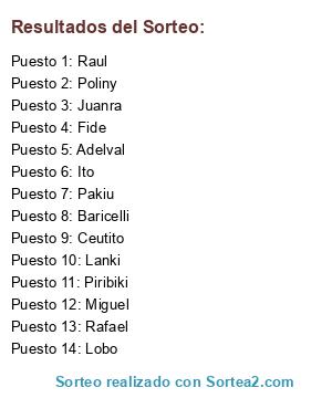 Lista de participantes: Piribiki, Poliny, Lobo, Rafael, Baricelli, Pakiu, Ito, Raul, Miguel, Fide, Ceutito, Juanra, Lanki, Adelval.