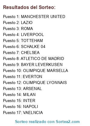 Lista de participantes: ARSENAL, LIVERPOOL, CHELSEA, MANCHESTER UNITED, EVERTON, TOTTEHAM, OLIMPIQUE MARSELLA, OLIMPIQUE LYONNAIS, INTER, LAZIO, MILAN, NAPOLI, ROMA, VAELNCIA, ATLETICO DE MADRID, BAYER LEVERKUSEN, SCHALKE 04.