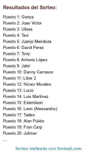 Lista de participantes: Gonza, Hector, Tadeo, Gabriel, Fran, Luis, Tavi, Jia Chen, Zizou, Julimar, Mario, Jean, Jose, Xavier, Jorge B., Alex B., Tony, J.L. Cuevas, Antonio, Juanjo, Danny C., David P., Andres M., Retro, Siglaz, Cristian, Gonza -2, Hector -2, Tadeo -2, Gabriel -2, Fran -2, Luis -2, Tavi -2, Jia Chen -2, Zizou -2, Julimar -2, Mario -2, Jean -2, Jose -2, Xavier -2, Jorge B. -2, Alex B. -2, Tony -2, J.L. Cuevas -2, Antonio -2, Juanjo -2, Danny C. -2, David P. -2, Andres M. -2, Retro -2, Siglaz -2, Cristian -2.